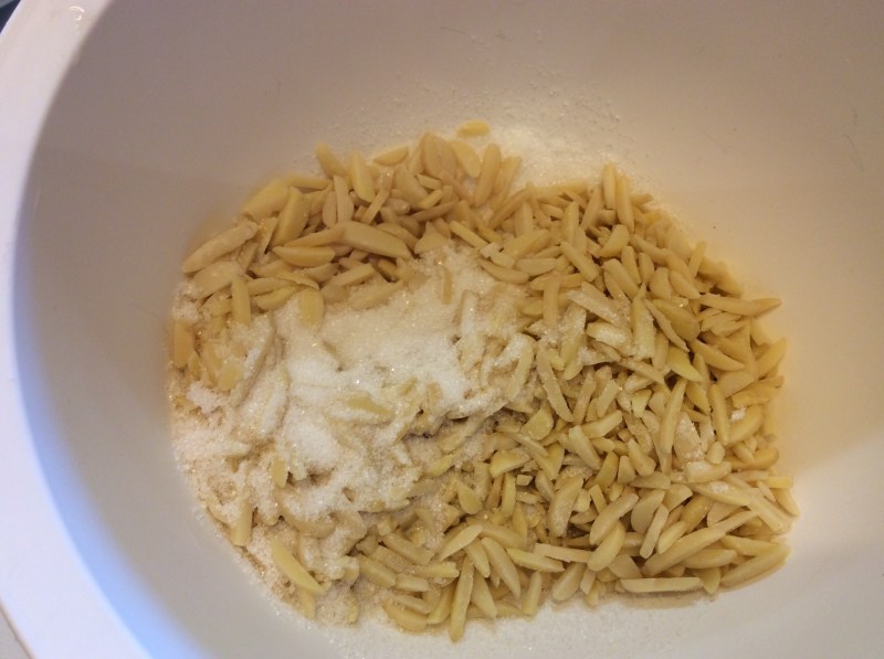 In una ciotola verso lo zucchero e le mandorle