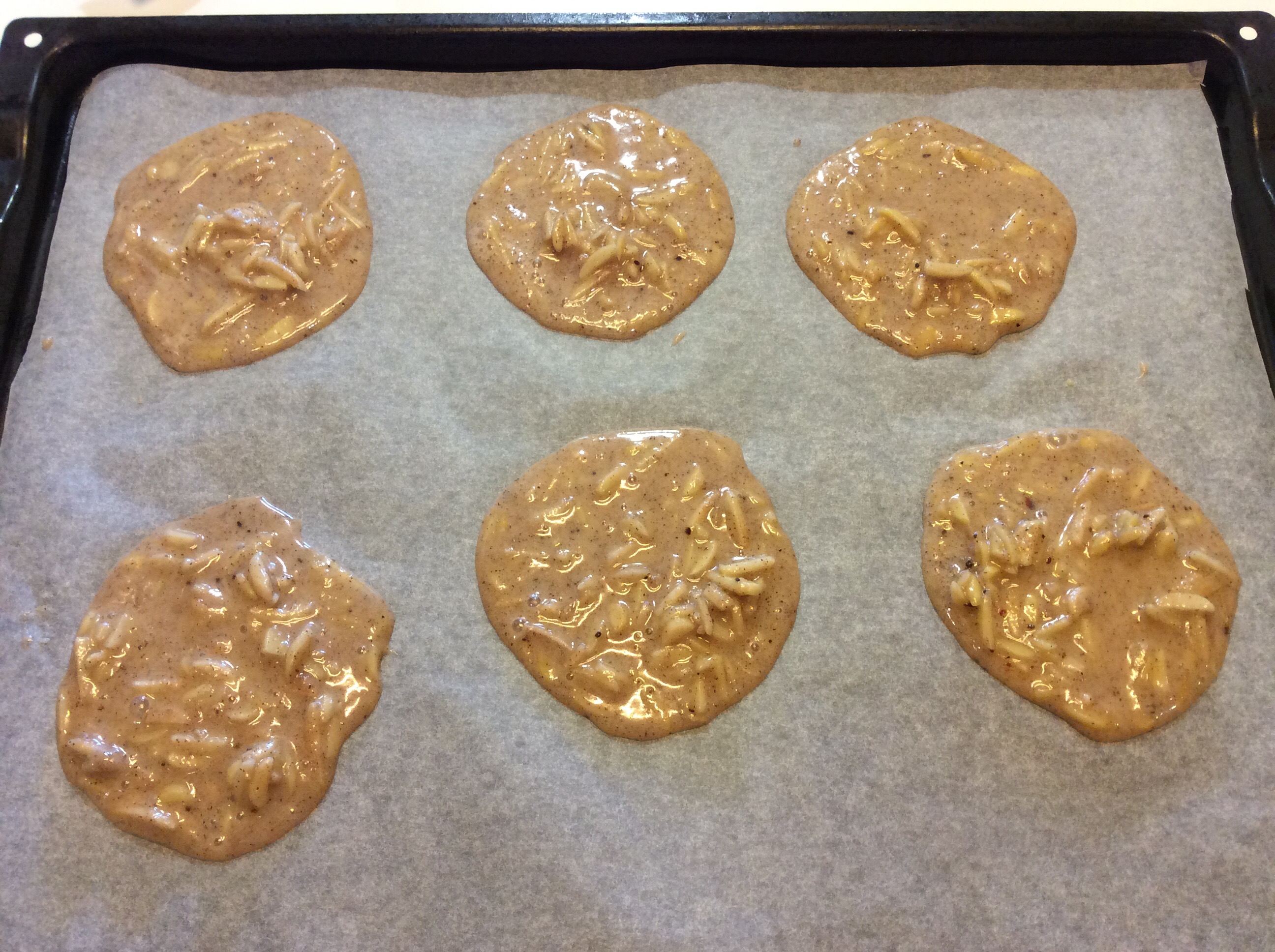 Ricopro le teglie con carta forno è trascorso il tempo di riposo con un cucchiaio verso dei mucchietti di impasto distanziati fra loro perchè in cottura si allargano, non fateli molto spessi