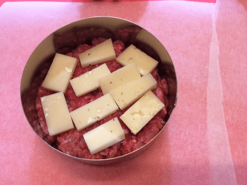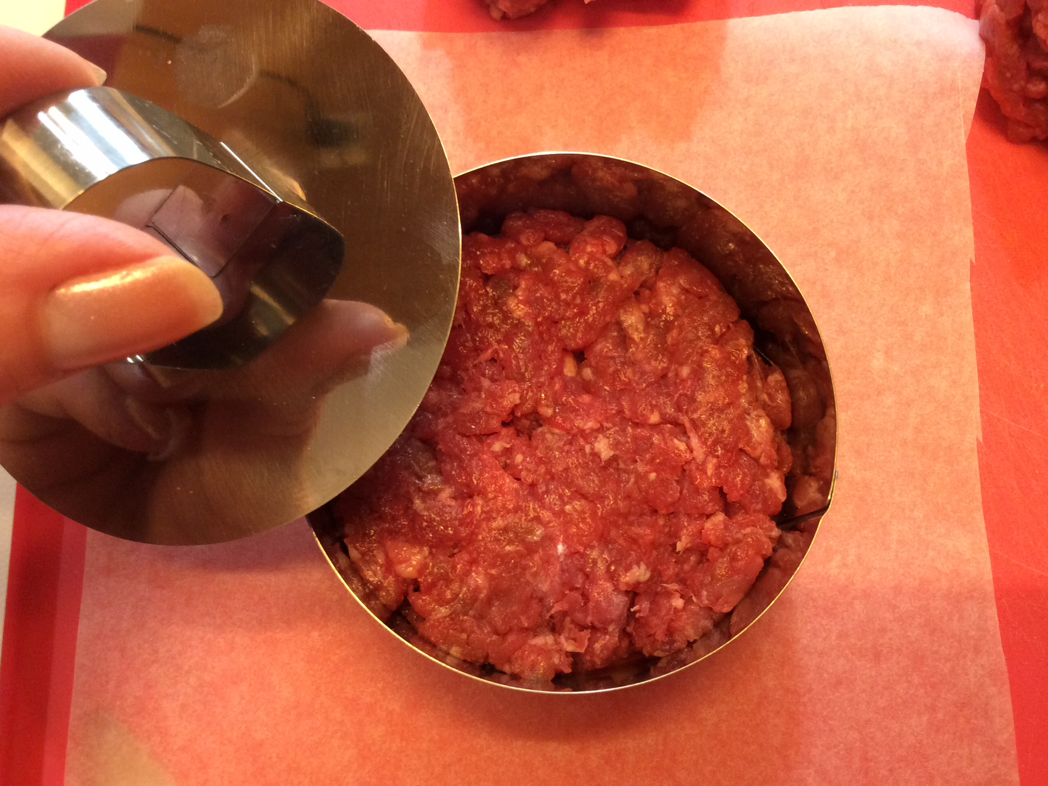 Mi appoggio su un foglio di carta forno, dispongo  una parte di carne sul fondo di un coppapasta pressando bene