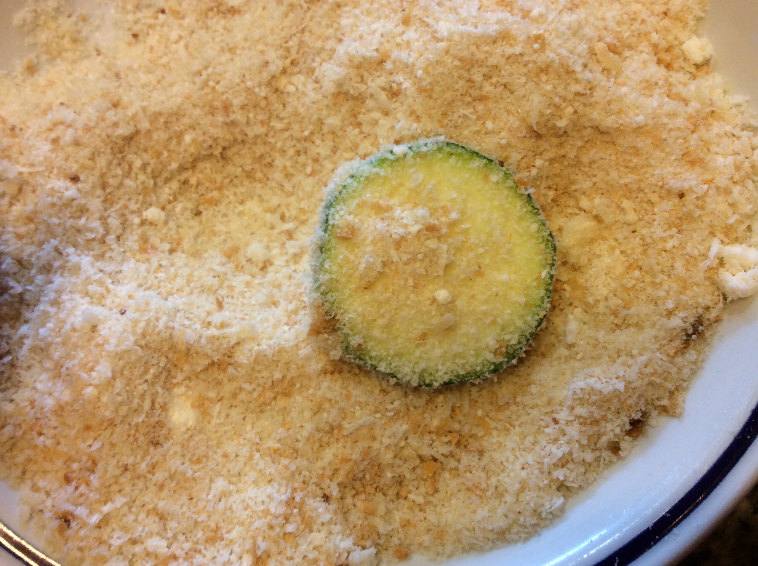 Avvolgo ogni fettina di zucchina nella panatura pressando leggermente in modo che siano ben ricoperte