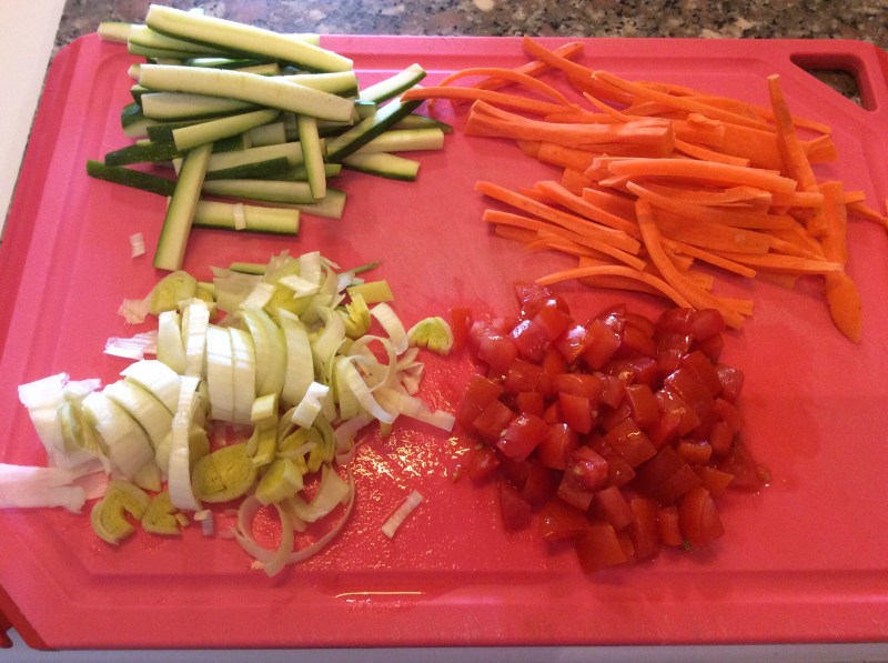 Taglio la carota e la zucchina a striscioline, i pomodorini a cubetti e anche il porro