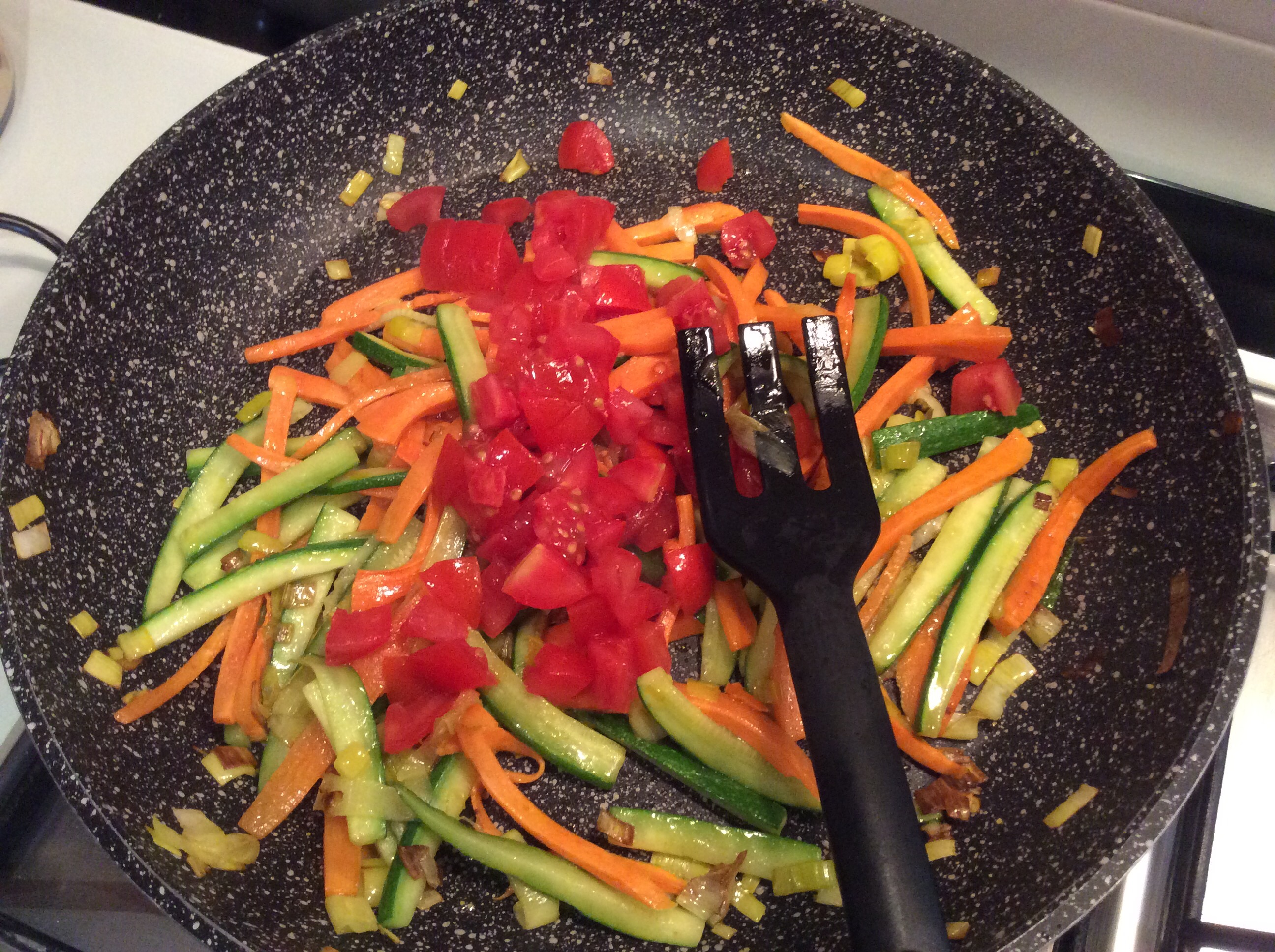 Cuocio alcuni minuti mantenendo le verdure croccanti, unisco i pomodorini e lascio un paio di minuti