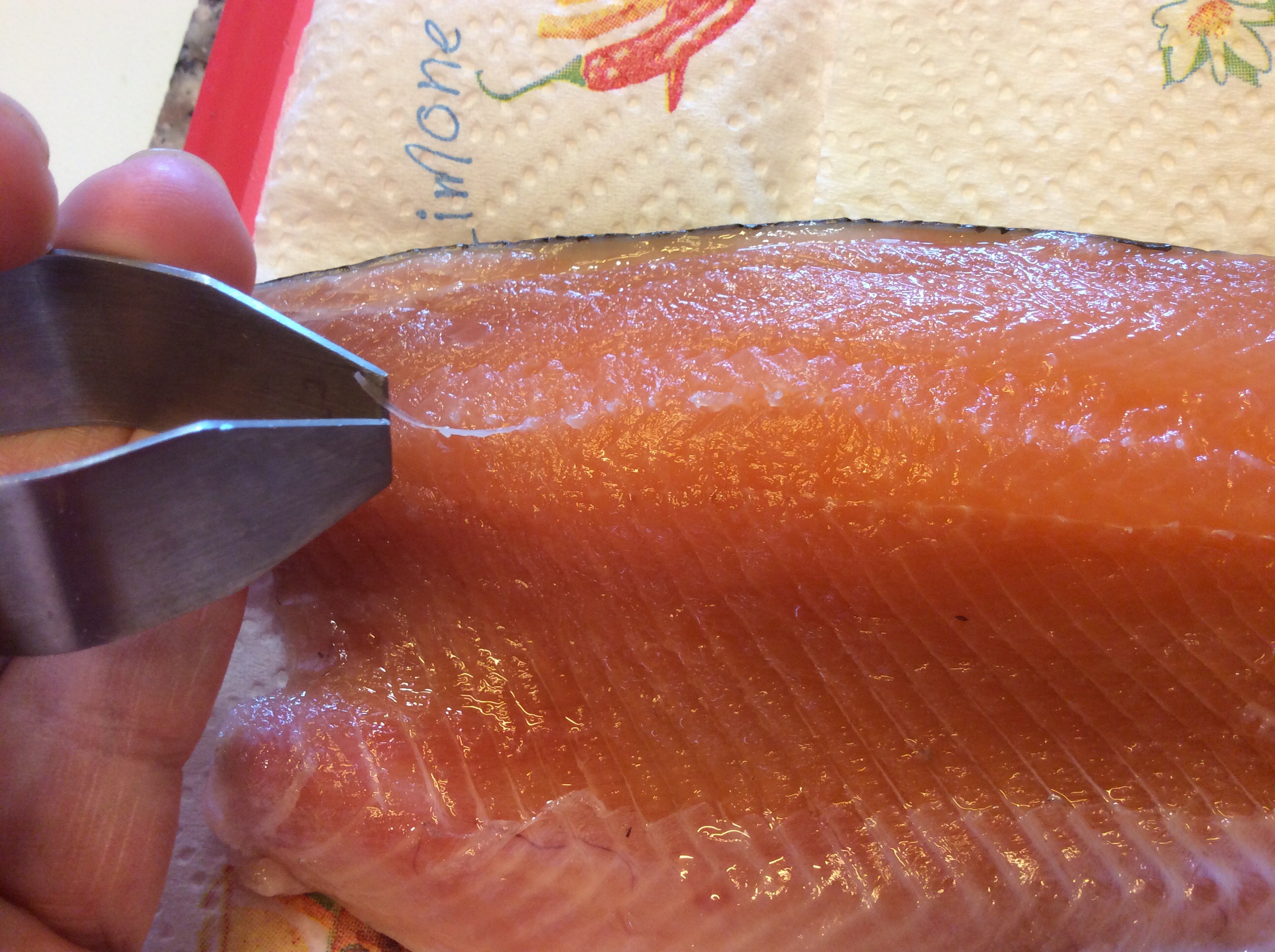 Prendo il filetto dalla parte della coda e inserisco la lama tra la pelle e la polpa tenendo la pelle con un foglio di carta da cucina