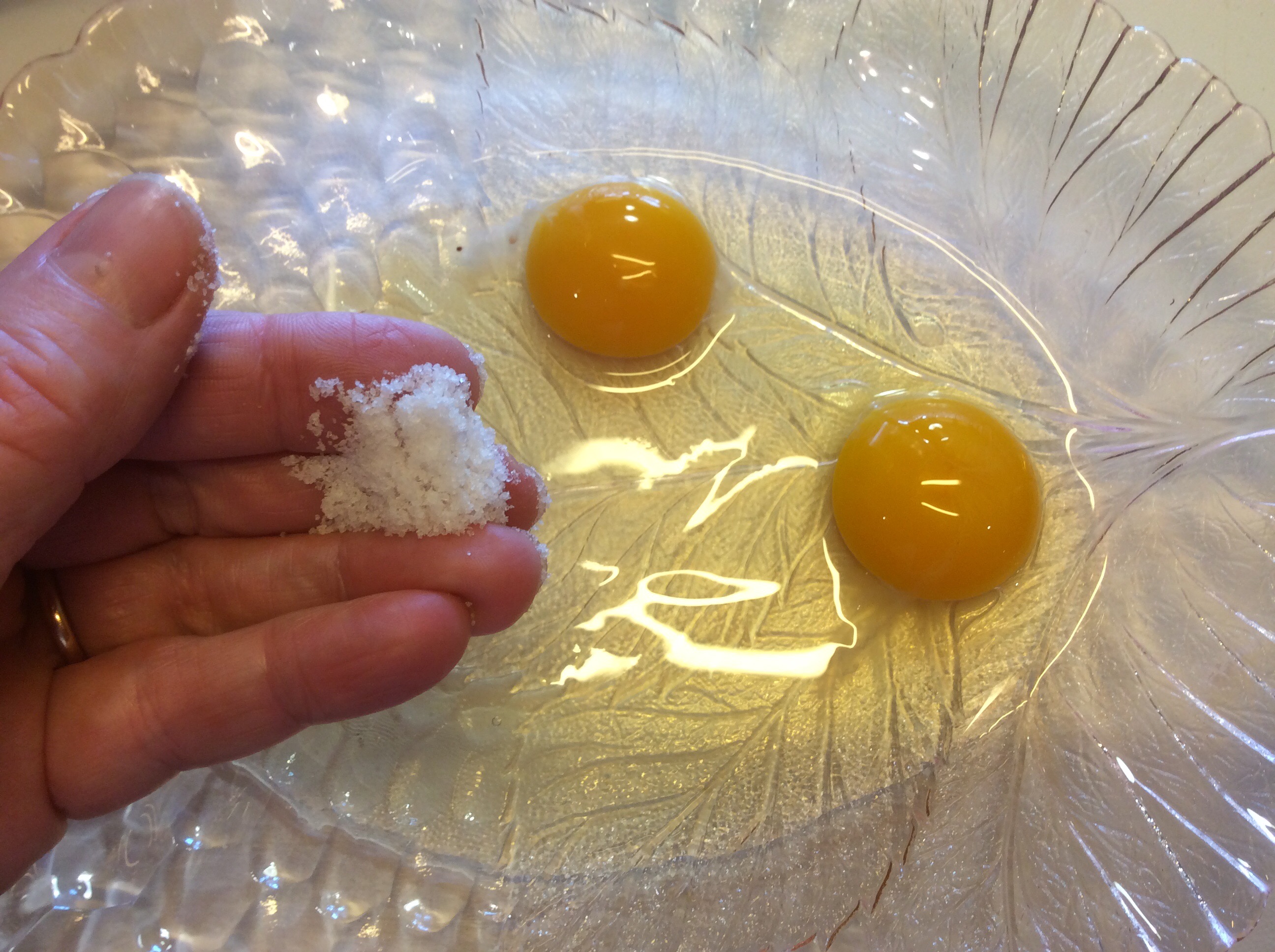 In un piatto rompo le uova, aggiungo poco sale e le batto con la forchetta