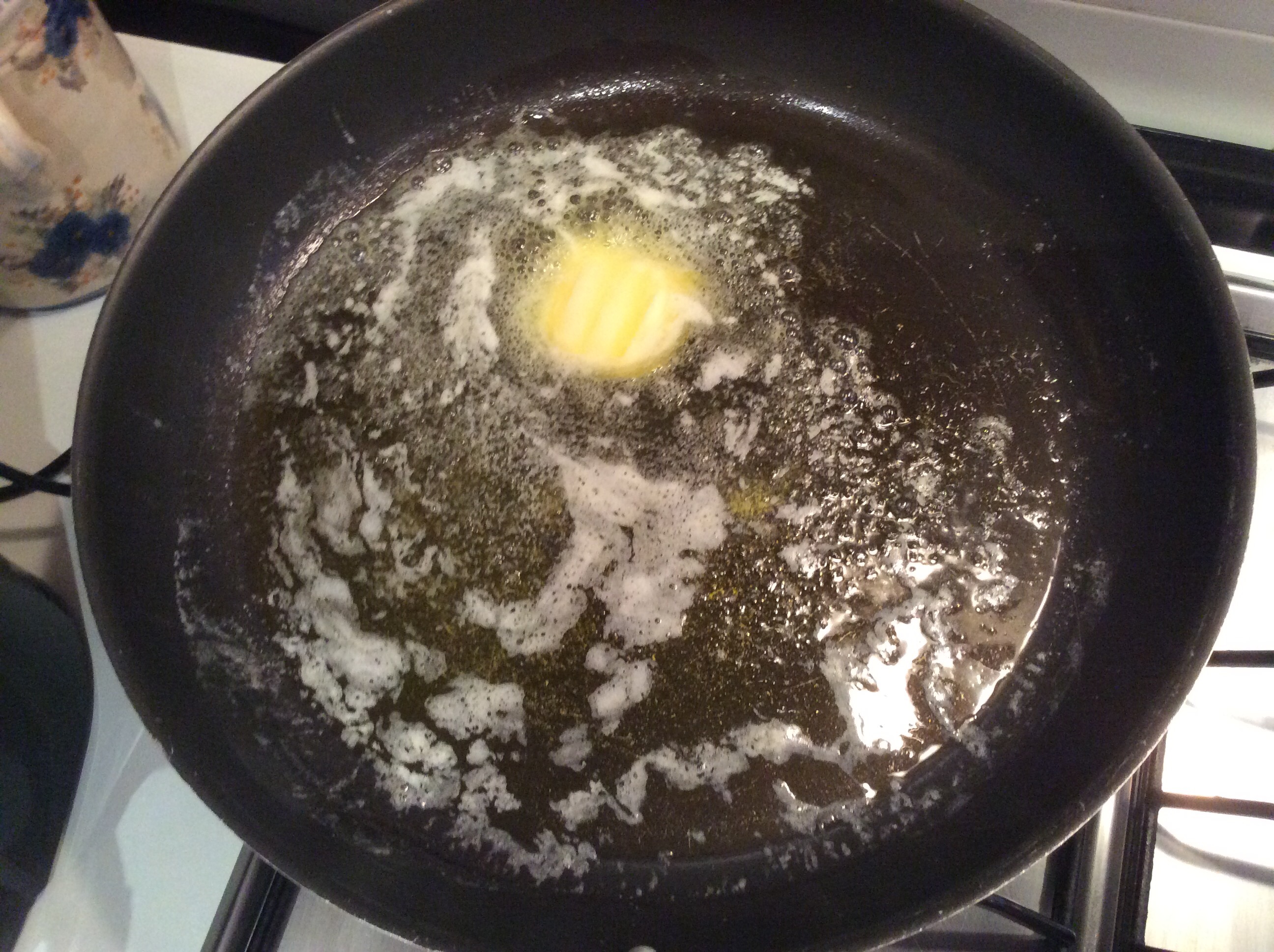 In una larga padella verso un bel pezzo di burro e una generosa dose di olio extravergine e lo scaldo