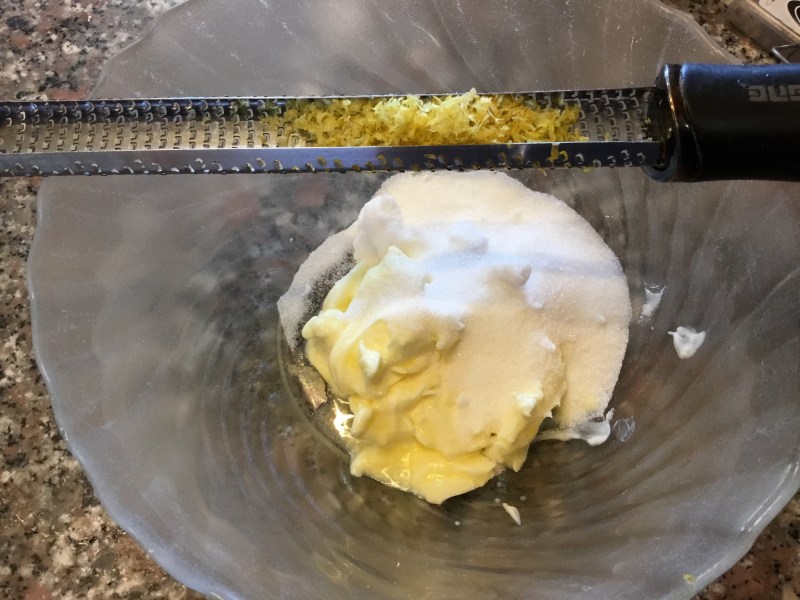 In un’altra ciotola verso il burro morbido, lo zucchero e la buccia del limone grattugiata