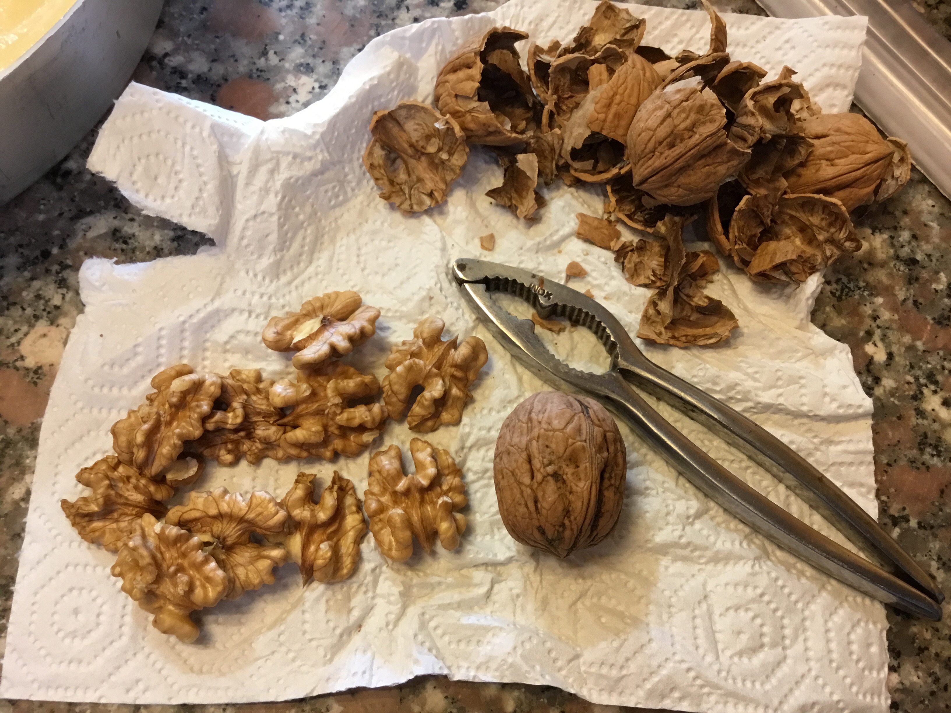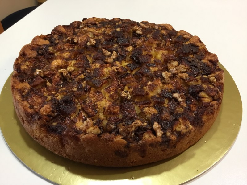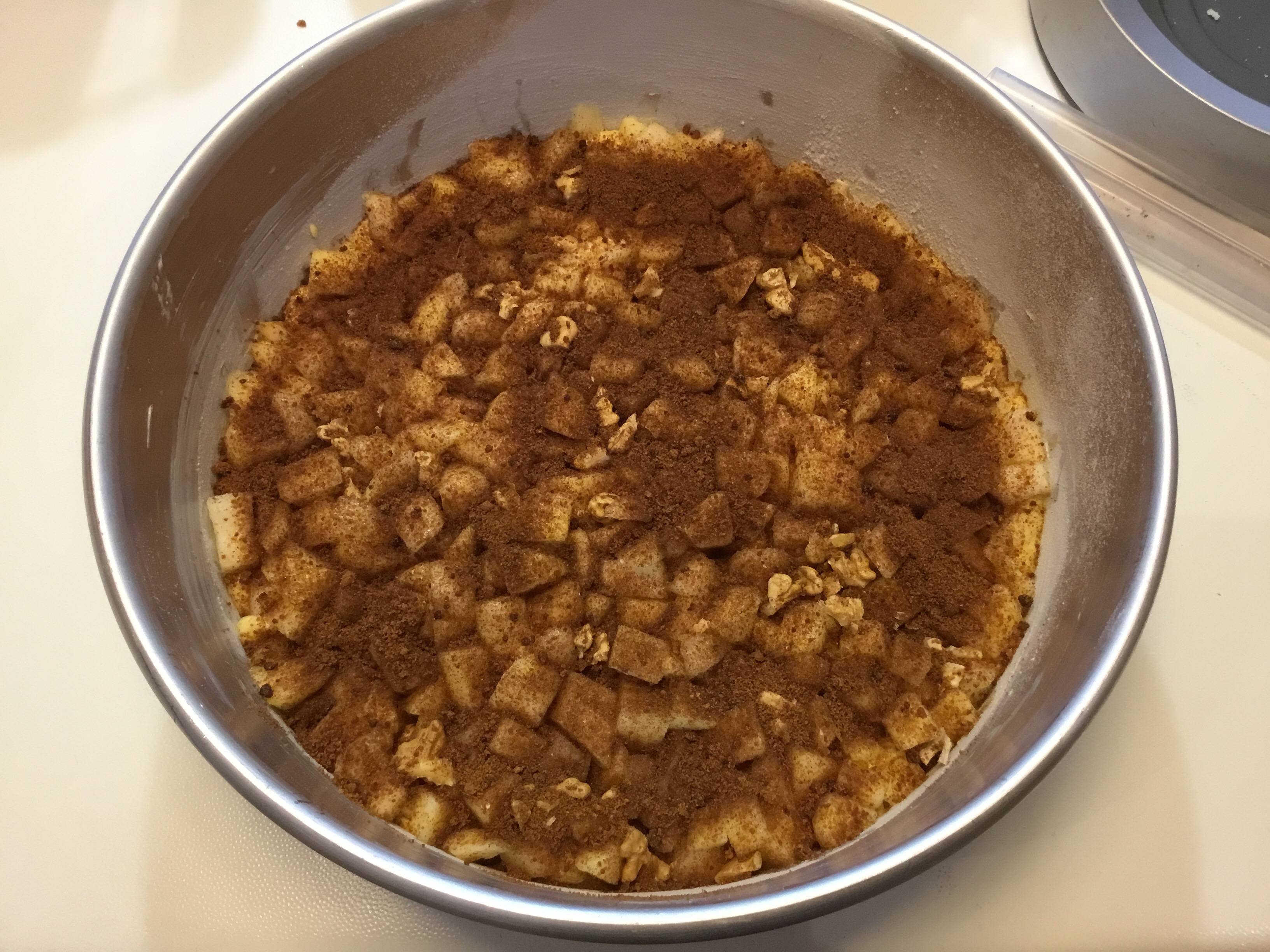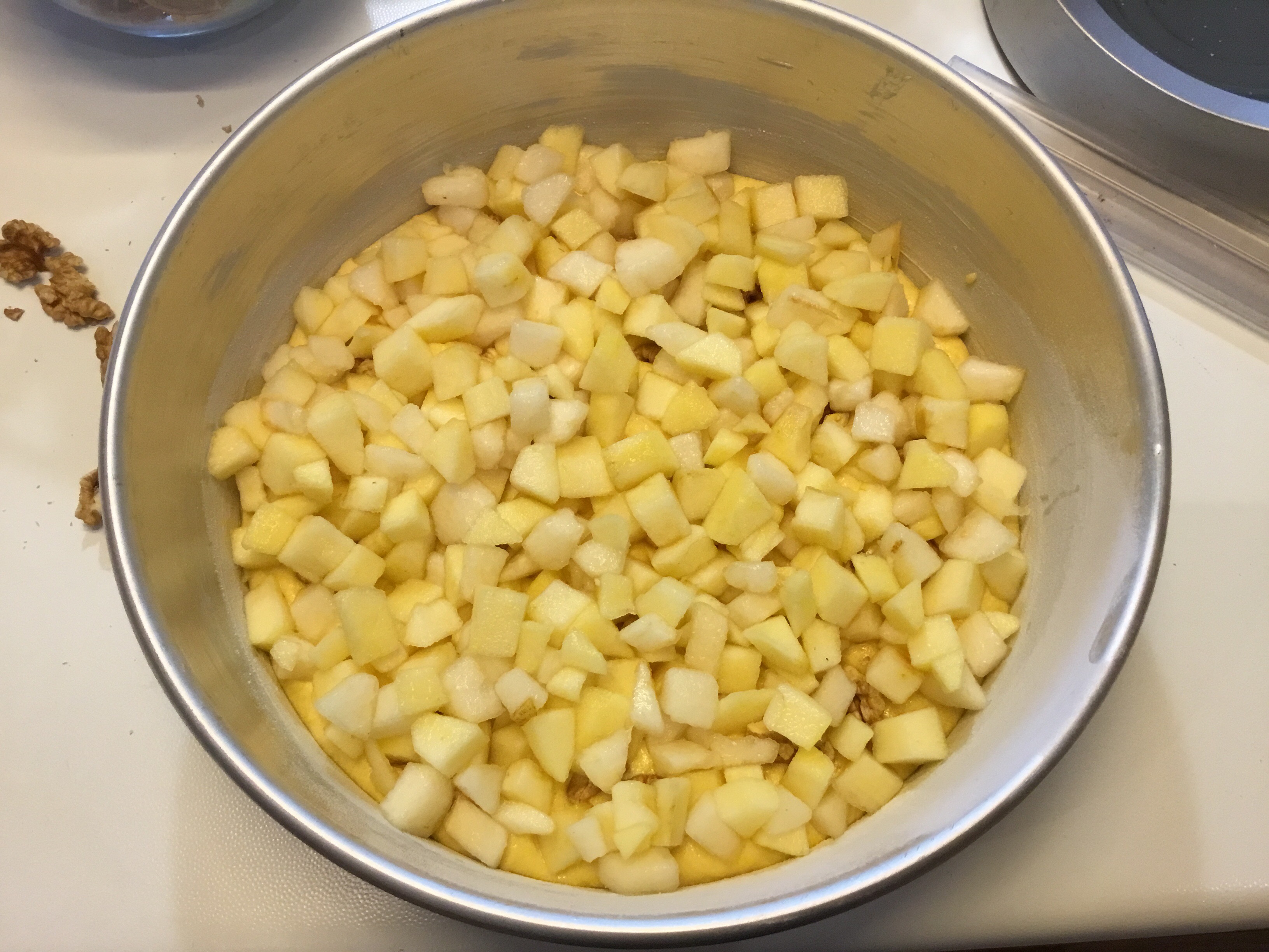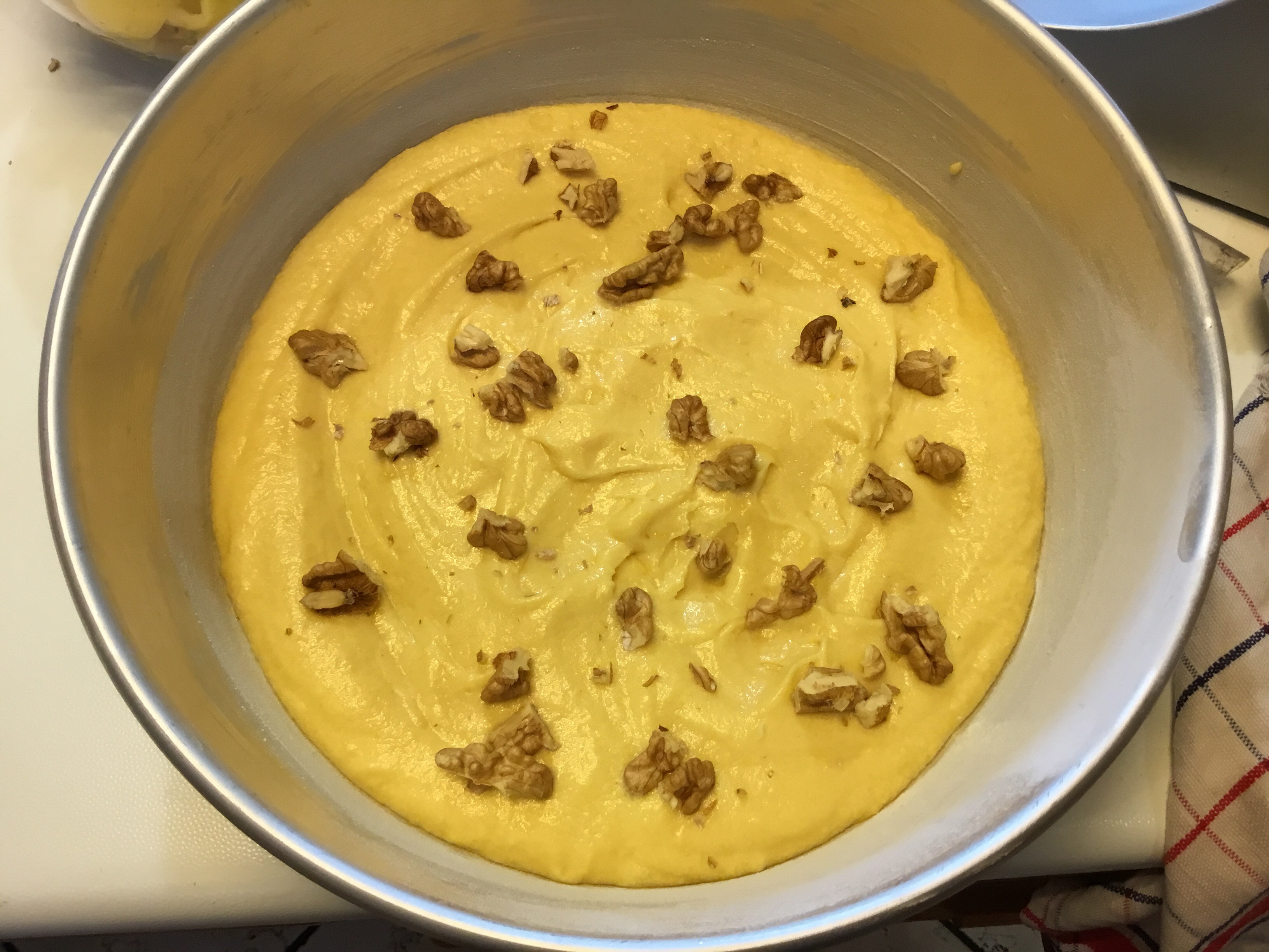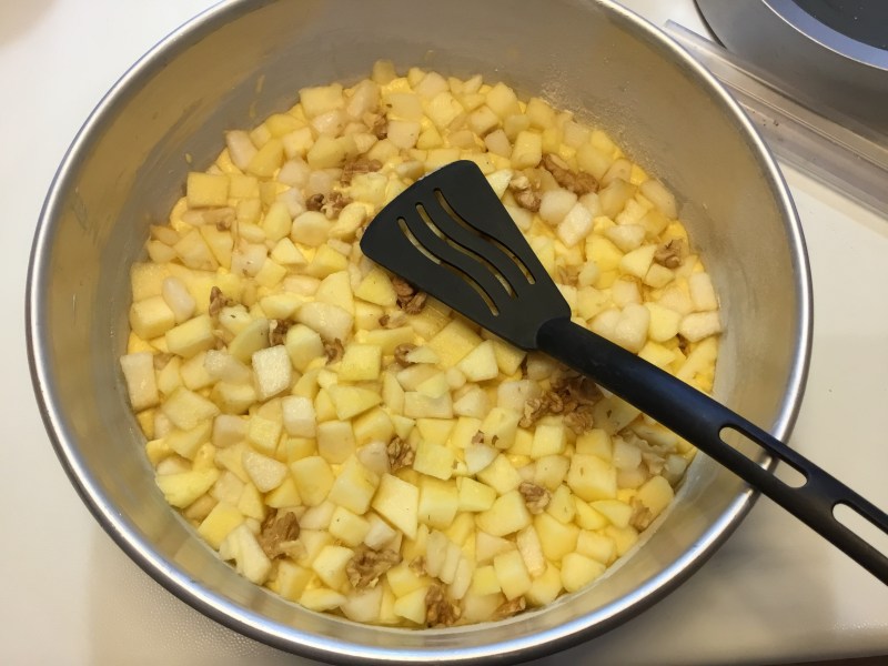 Sbriciolo il resto delle noci e con una spatola o con le mani livello bene pressando un po’ in modo da affondare la frutta nell’impasto