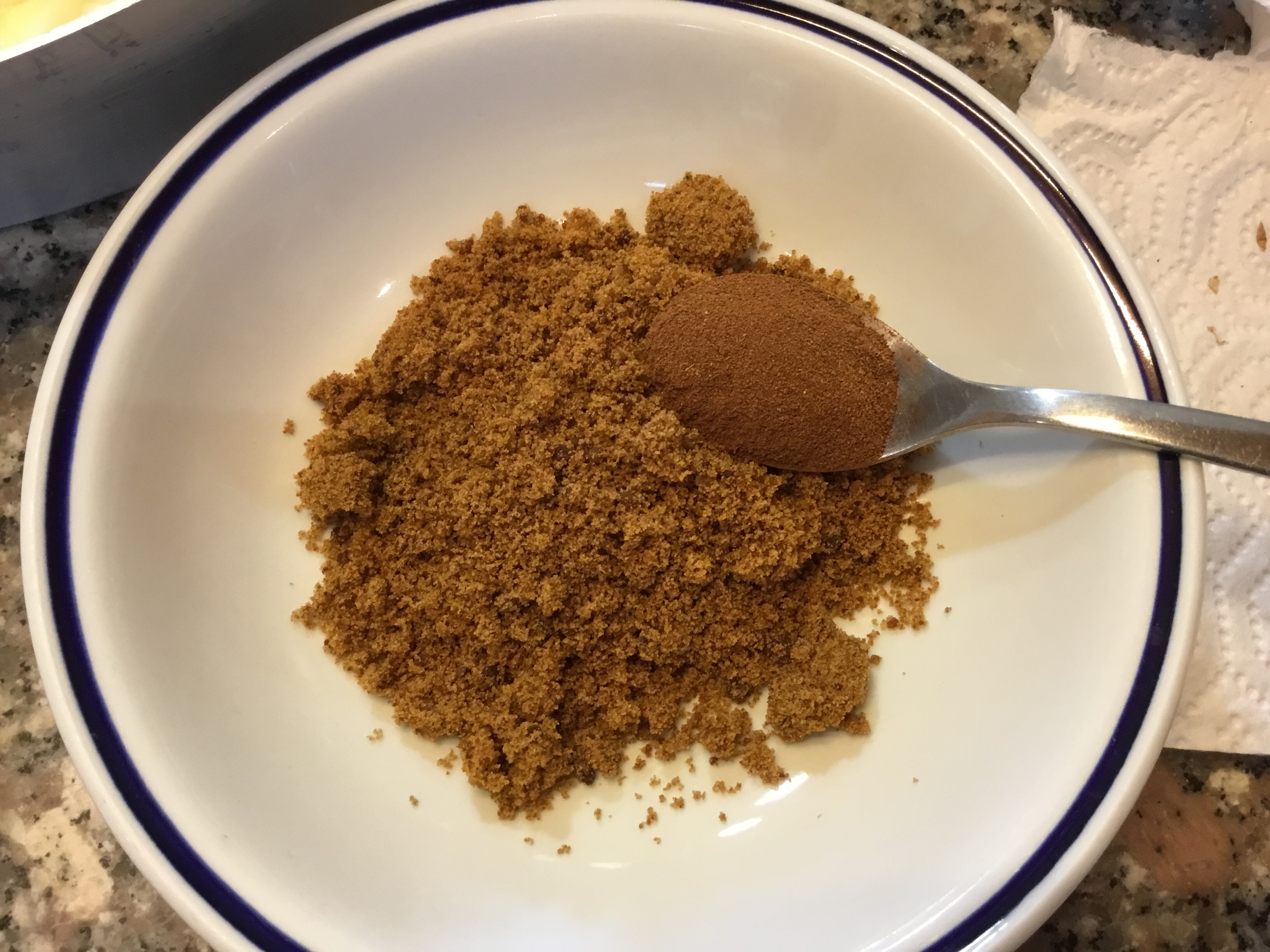 In una ciotola mescolo 3 cucchiai di zucchero di canna e 1 cucchiaino di cannella