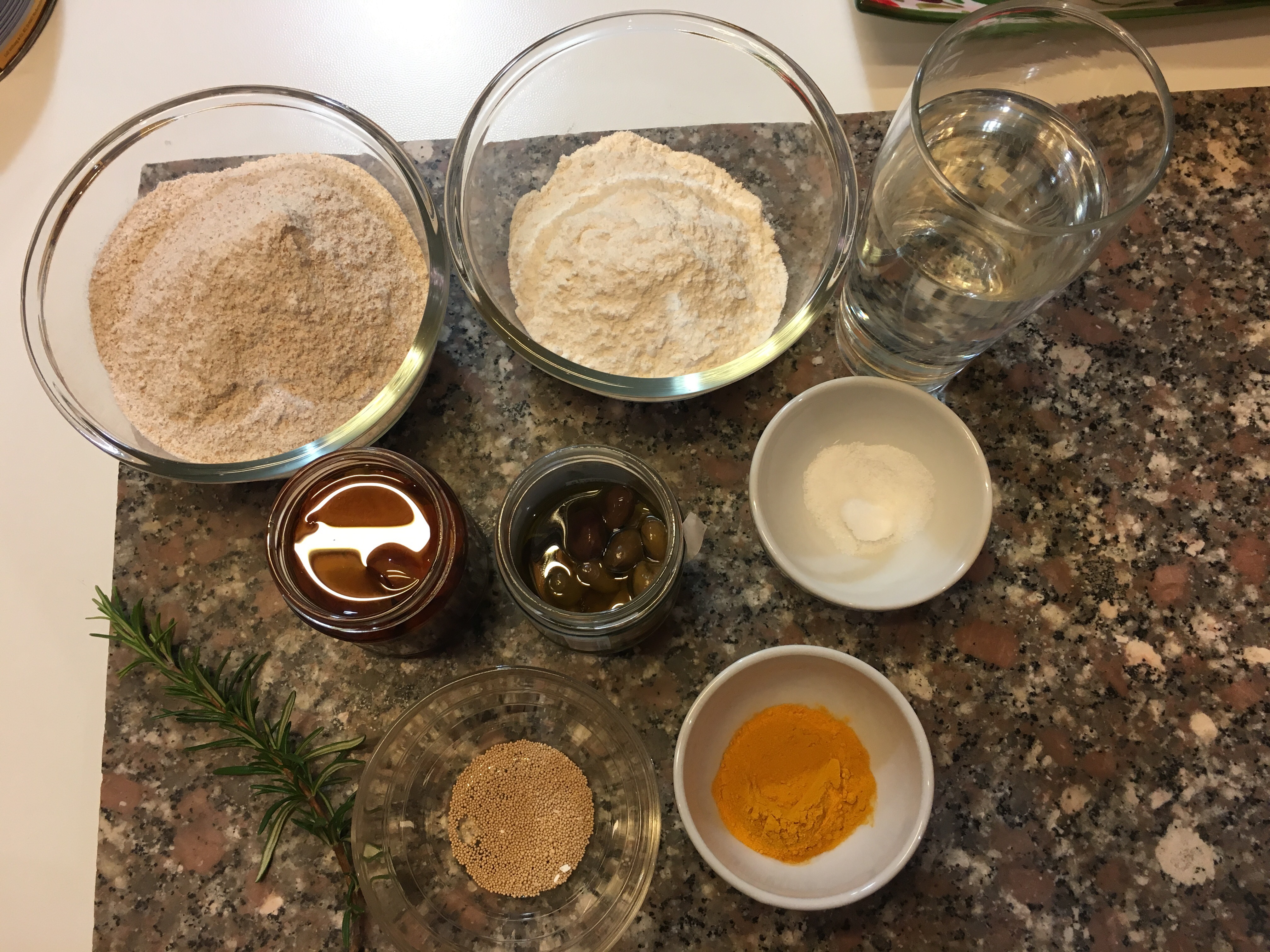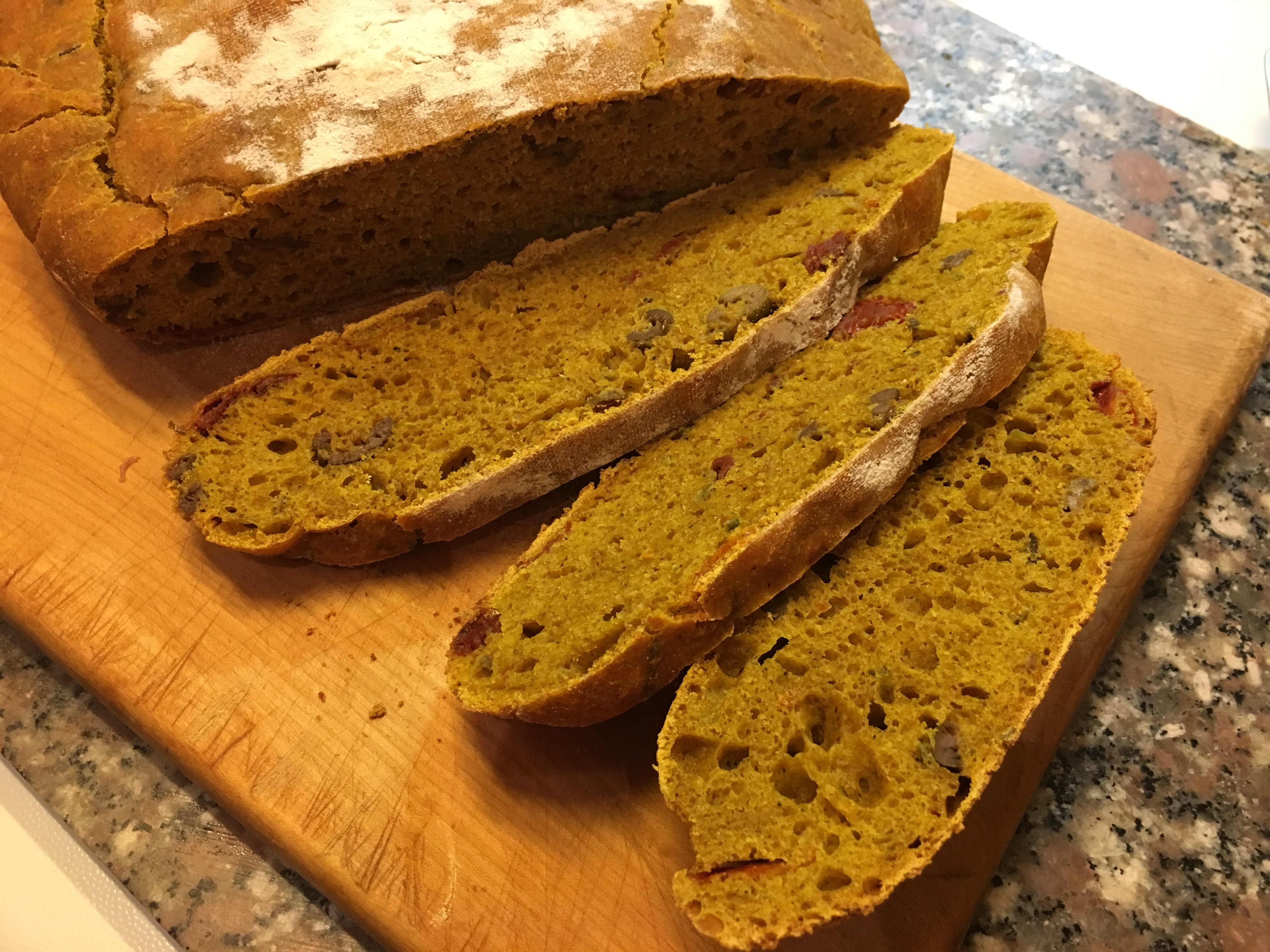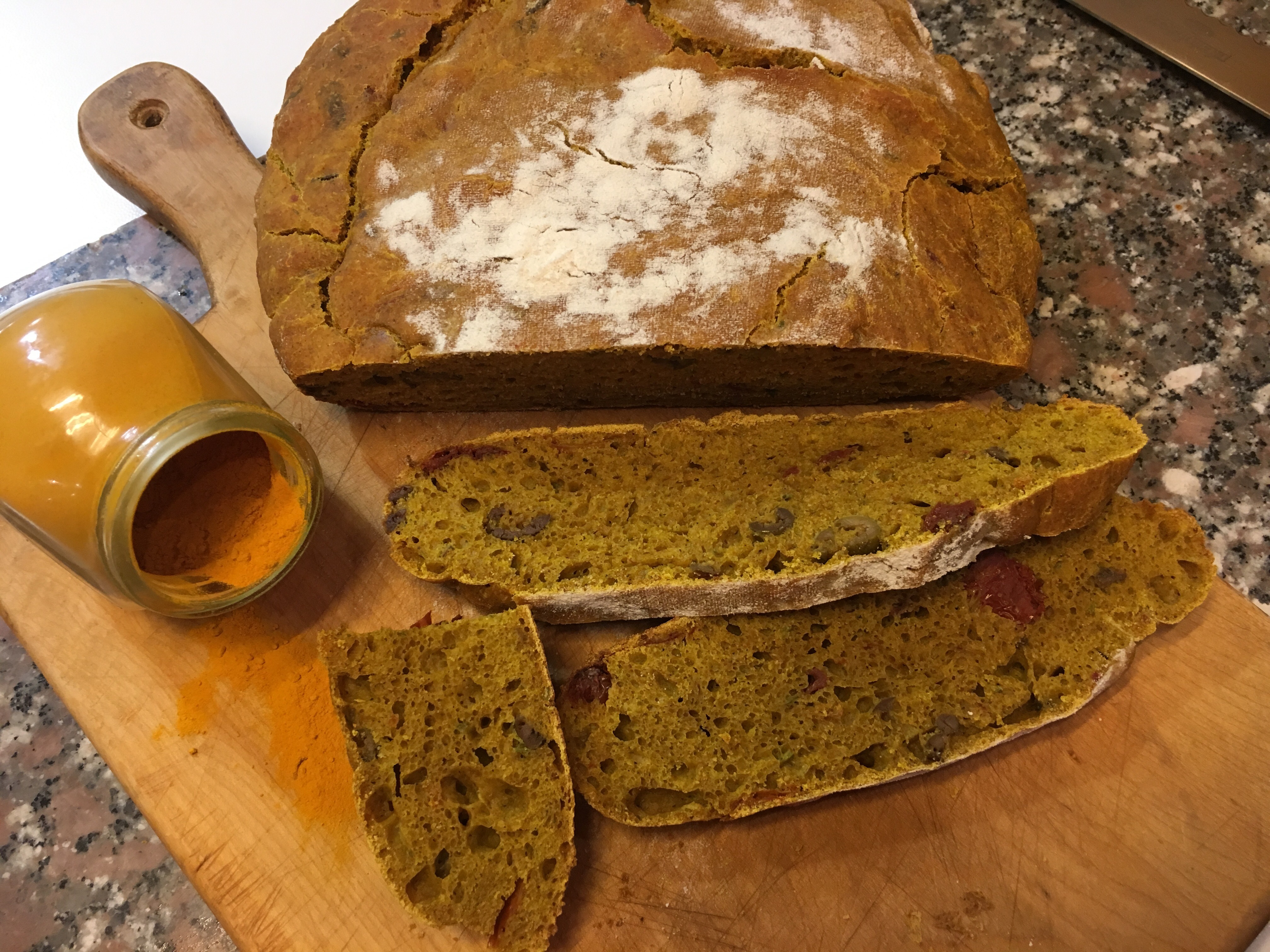 PANE INTEGRALE ALLA CURCUMA CON OLIVE E POMODORINI SECCATI SENZA IMPASTO