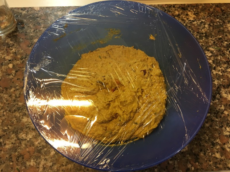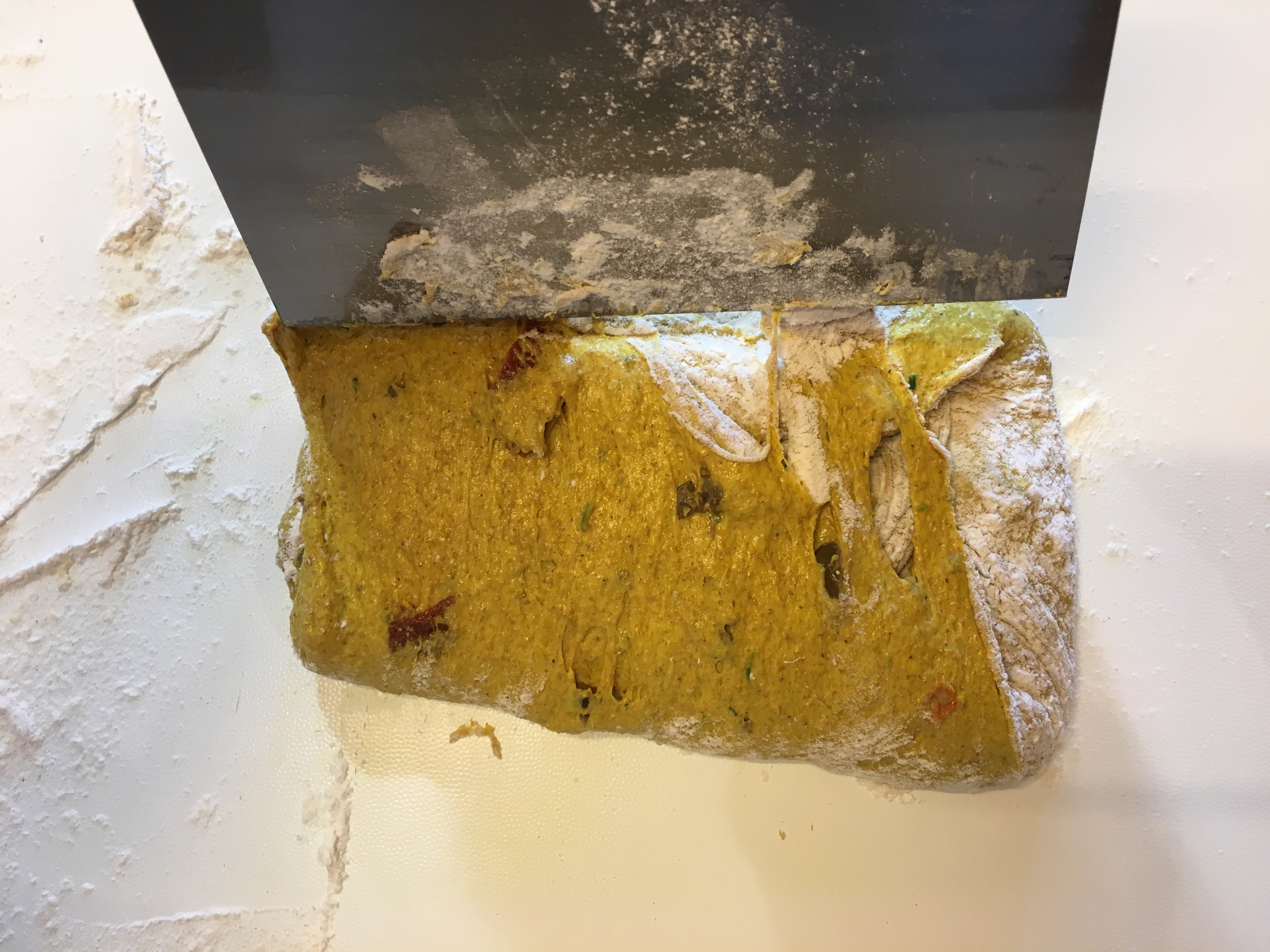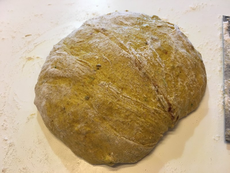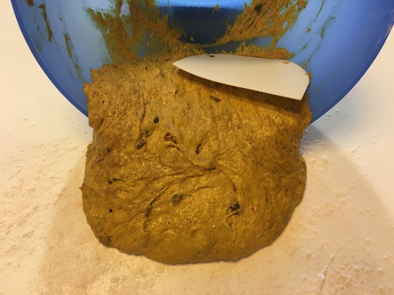 PANE INTEGRALE ALLA CURCUMA CON OLIVE E POMODORINI SECCATI SENZA IMPASTO