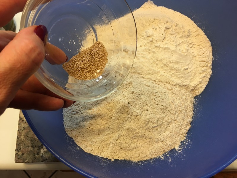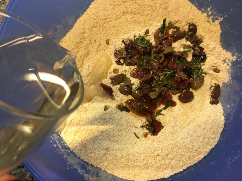 Trito grossolanamente olive, pomodorini, e rosmarino  e li aggiungo alle polveri, poi unisco l’acqua tutta in una volta