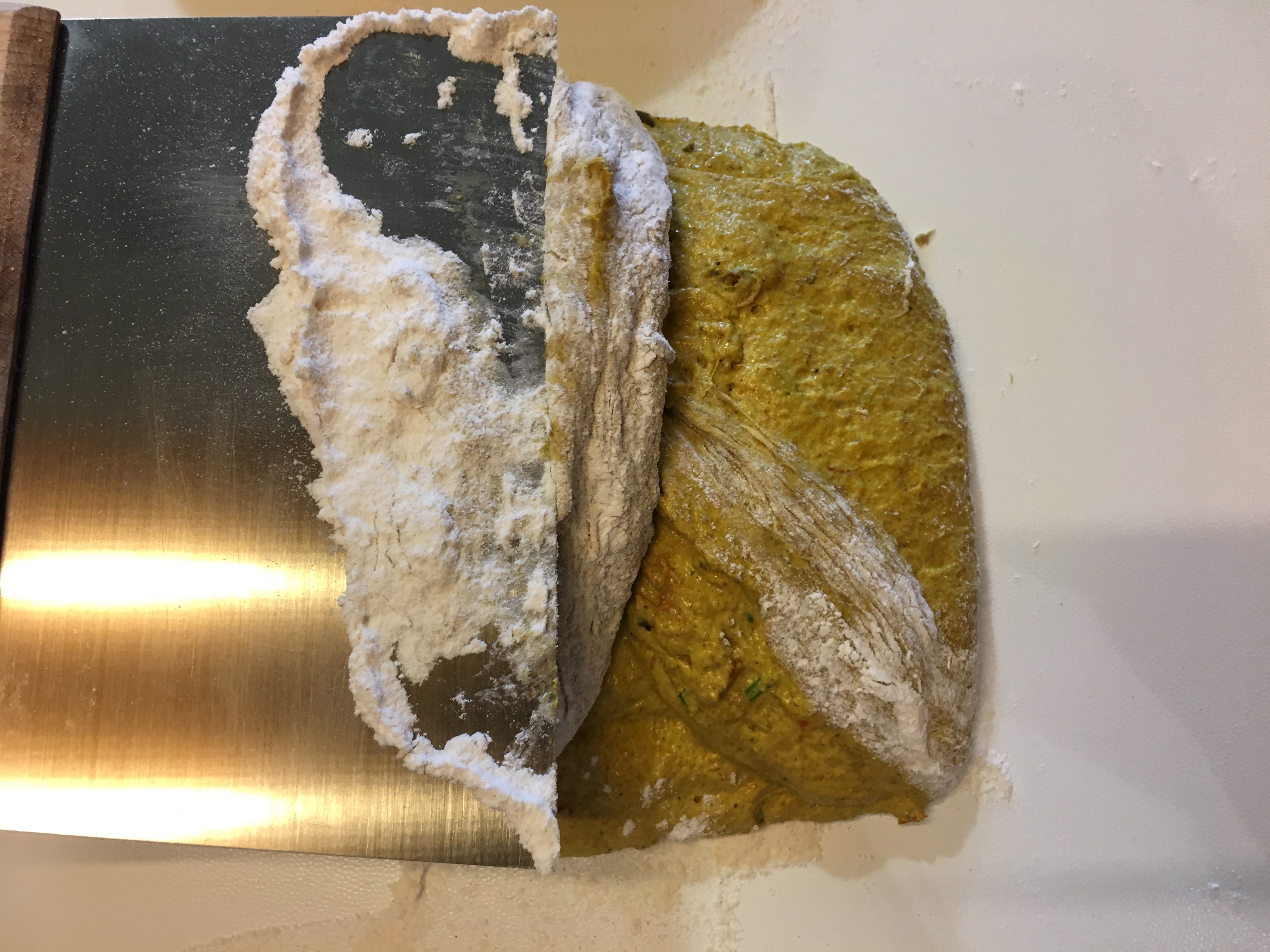 Infarino la spatola e continuo portando il lato verso di me a metà verso l’alto, spolverizzo di farina, ripeto queste operazioni un paio di volte, l’impasto prenderà un po’ di forza