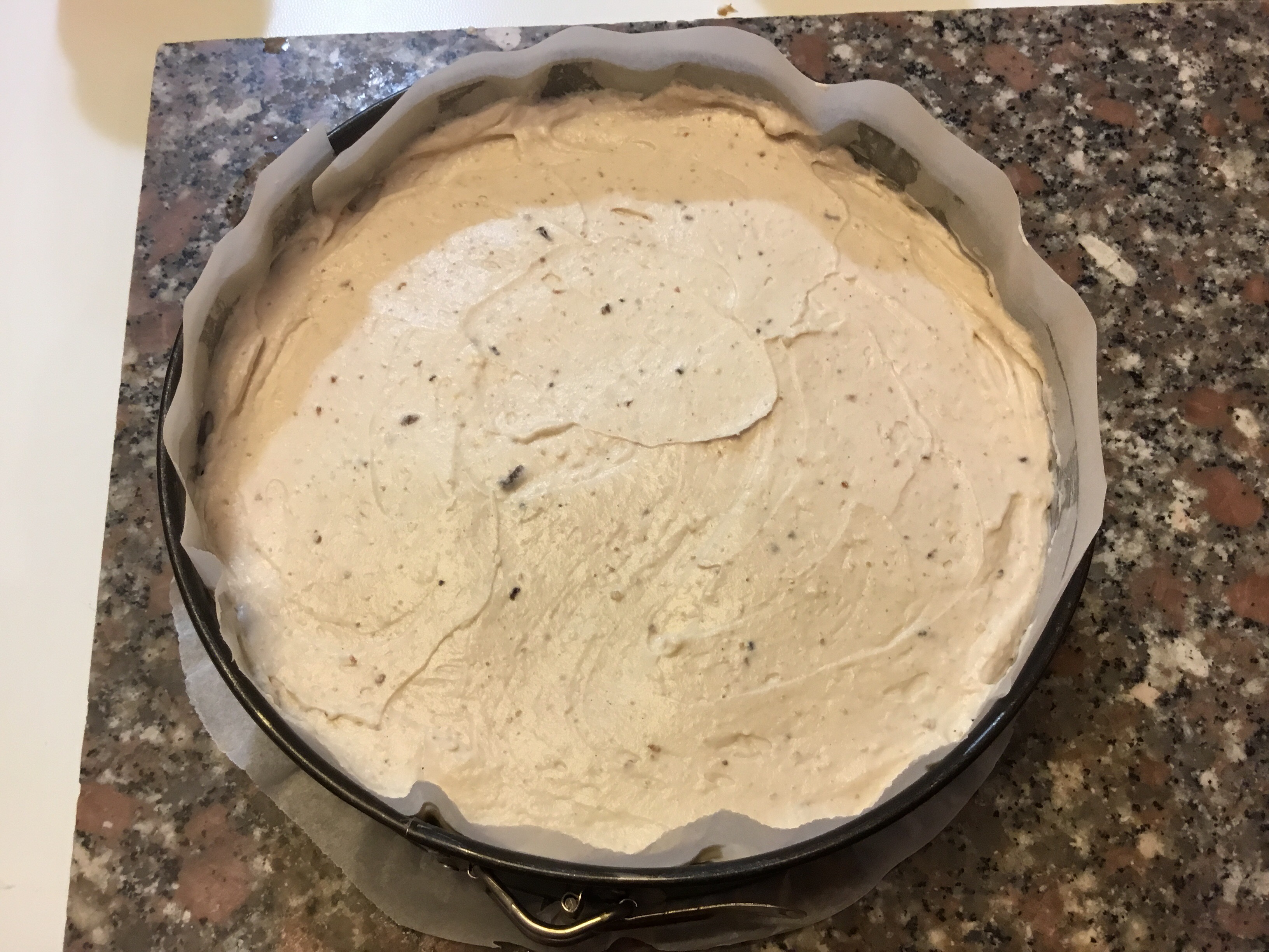 Dispongo il composto in una tortiera rivestita di carta forno livellandolo bene aiutandomi con un batticarne, ripongo la tortiera in frigorifero
