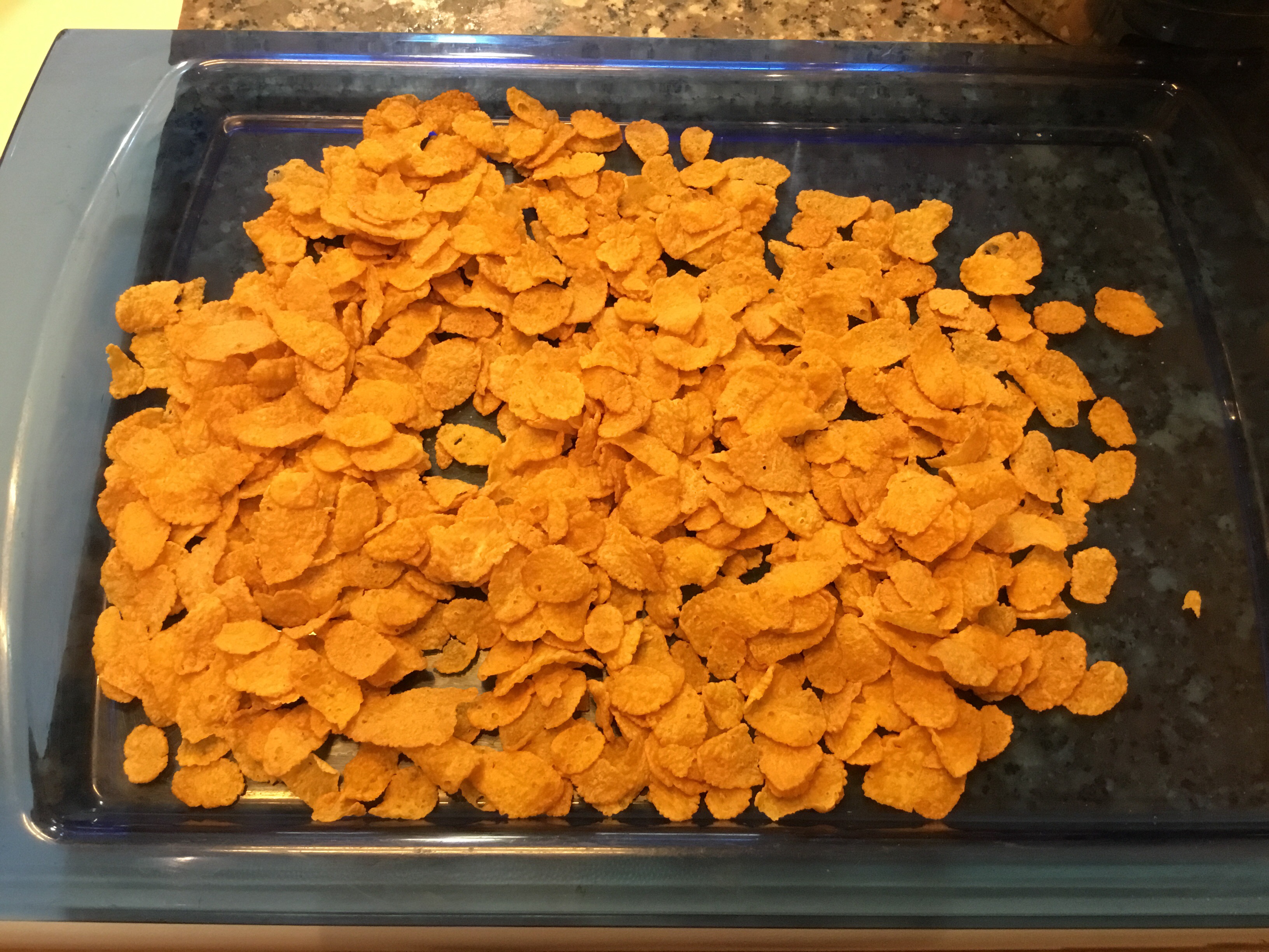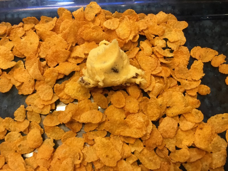 Con un cucchiaio prelevo delle piccole quantità di impasto grosse come una noce  e le appoggio sui corn flackes