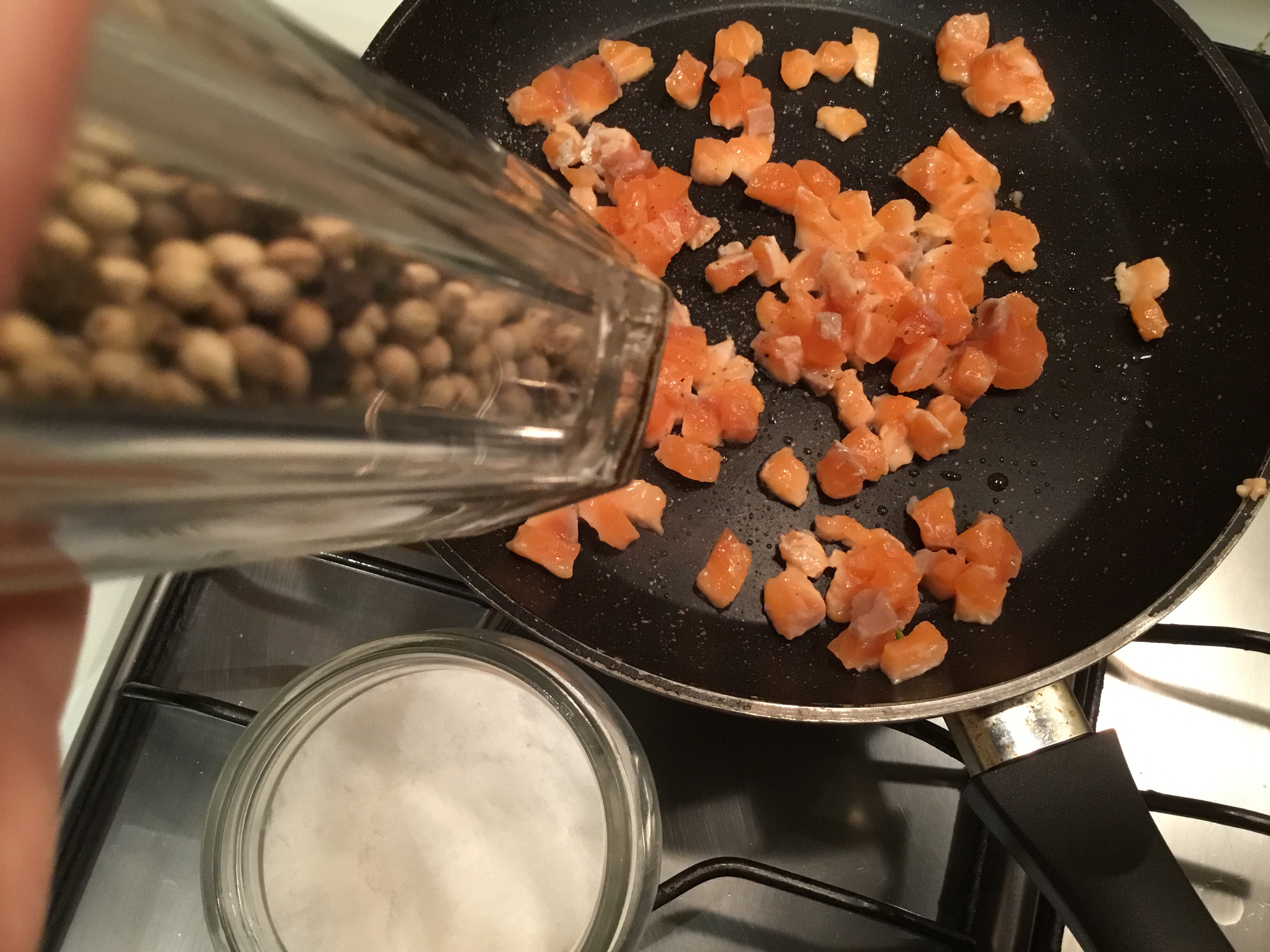 Prendo il salmone tagliato a cubetti piccoli, e lo rosolo velocemente con pochissimo olio, aggiungo poco sale e pepe