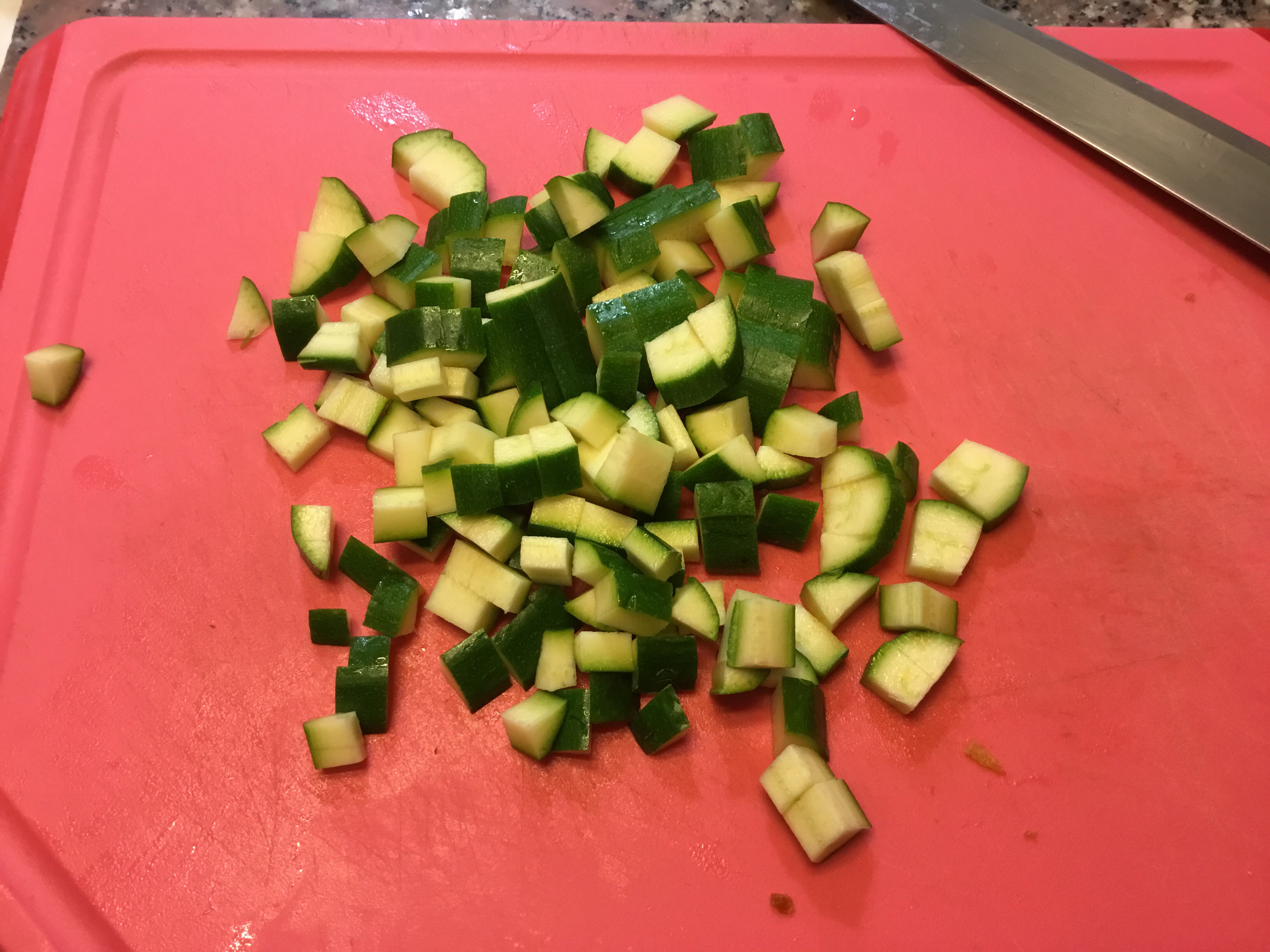 Taglio la zucchina a cubetti e la rosolo in padella velocemente con sale e pepe, tenendole croccanti