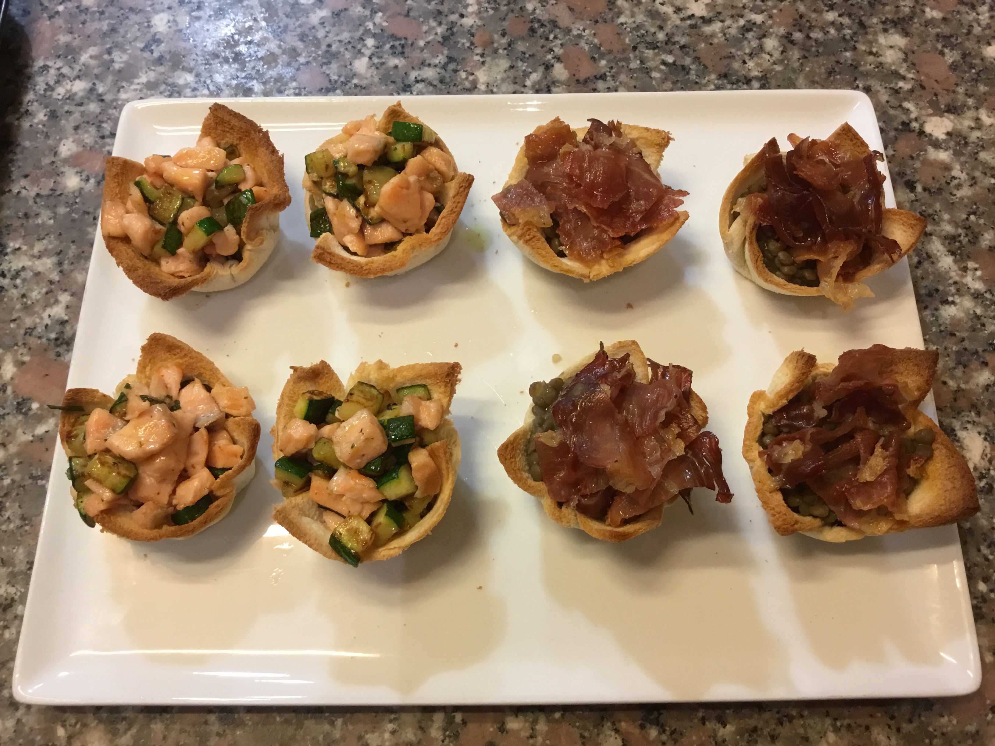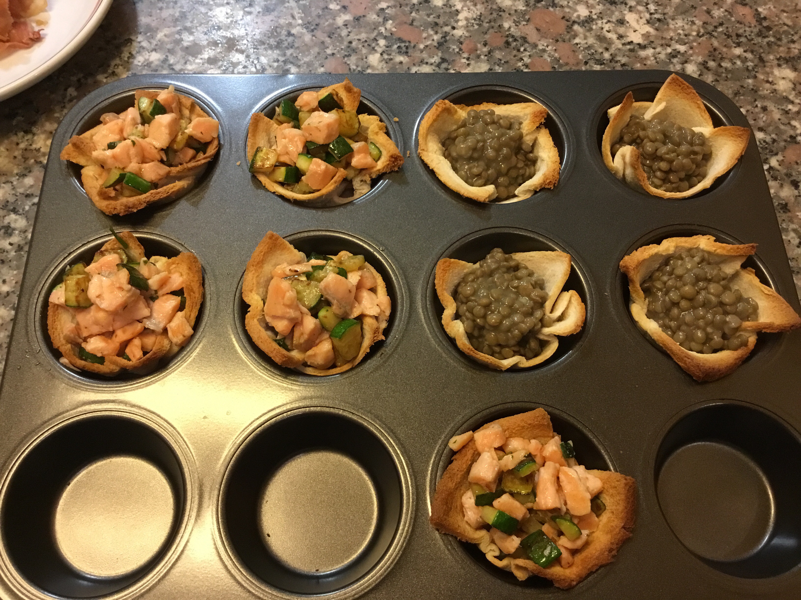 Distribuisco il ripieno di salmone e zucchine nei cestini e termino con un filo di olio, aggiungo negli altri le lenticchie