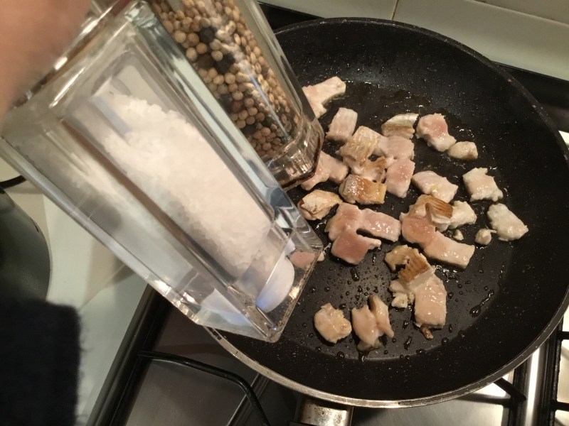 In una padella verso dell”olio extravergine e quando é caldo aggiungo il coregone, sale e pepe, poco sale perché i capperi sono già sapidi