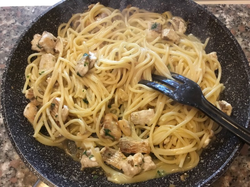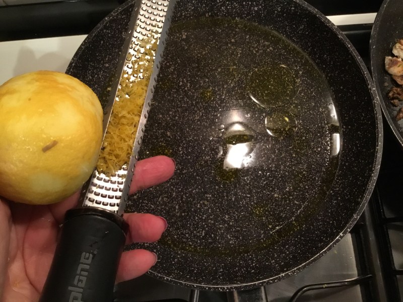 Preparo un pentolino con acqua salata (1 litro di acqua e 10 gr di sale) e la porto a bollore, in una padella verso 2 0 3 mestoli di acqua salata e la buccia grattugiata di un grosso limone biologico e 2 o 3 cucchiai di olio extravergine