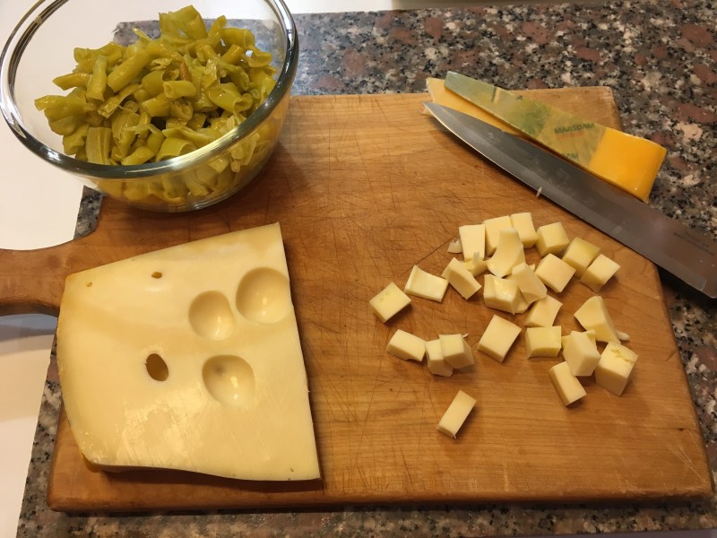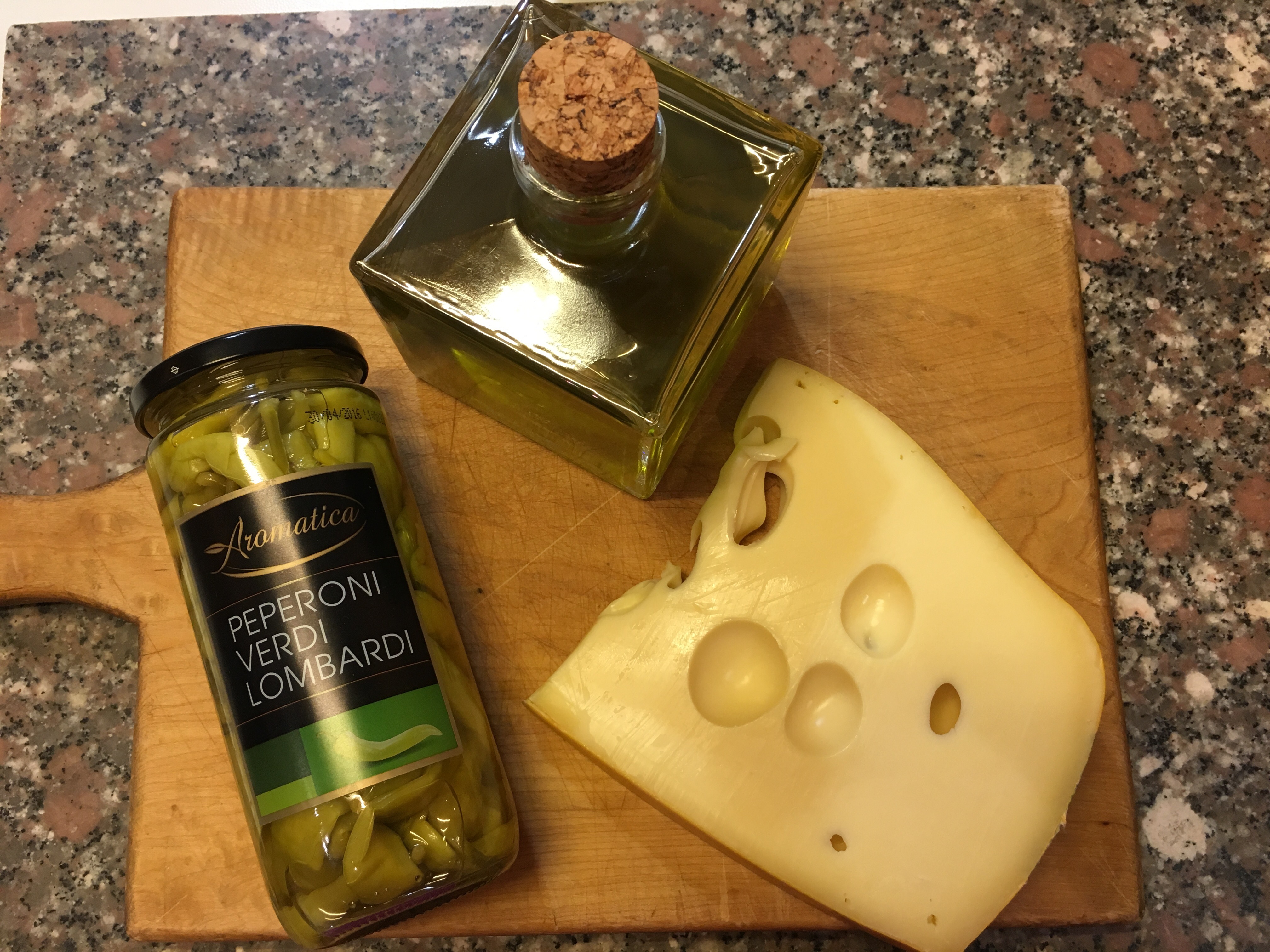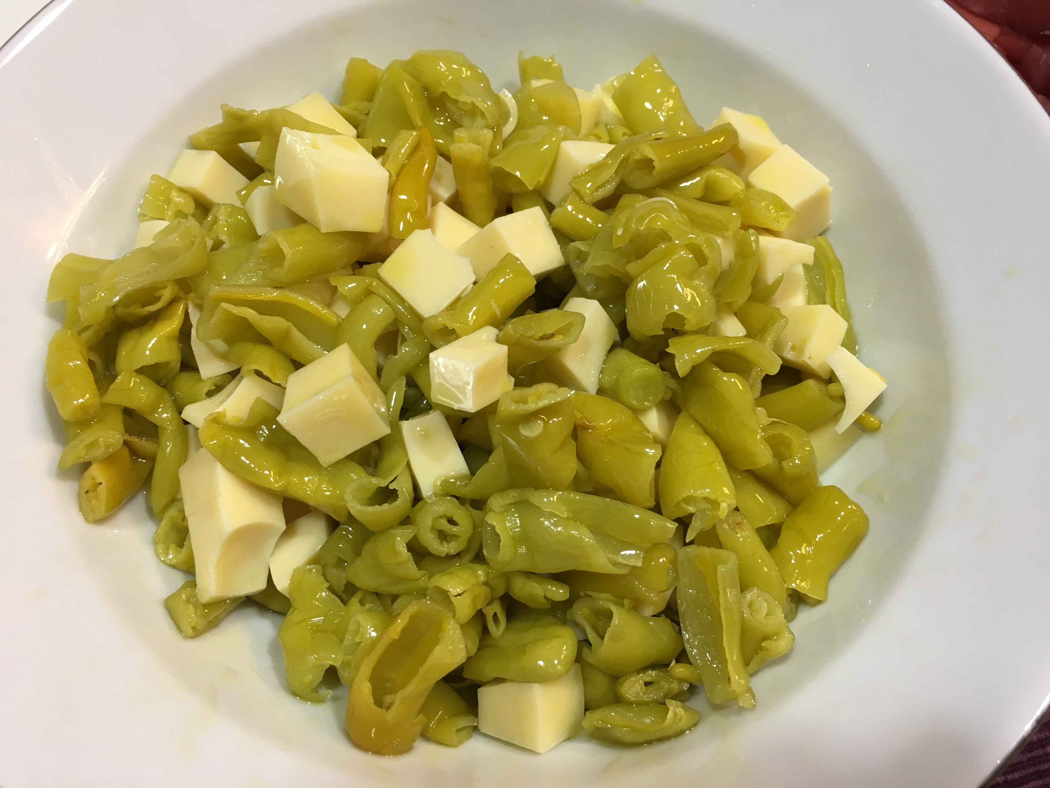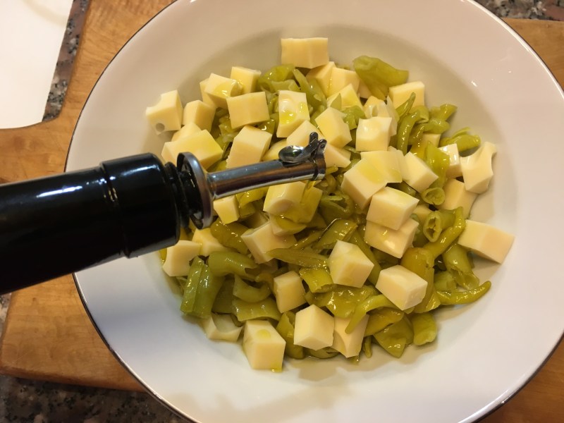 In una ciotola unisco peperoni e formaggio e aggiungo abbondante olio extravergine