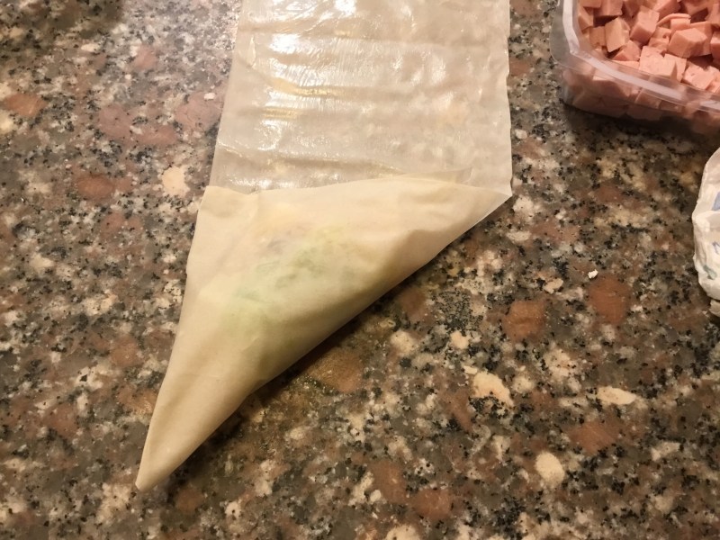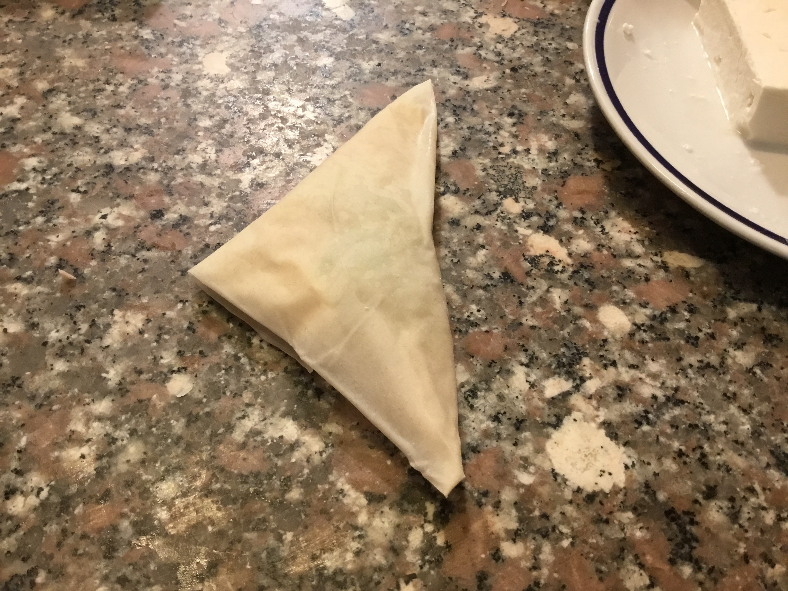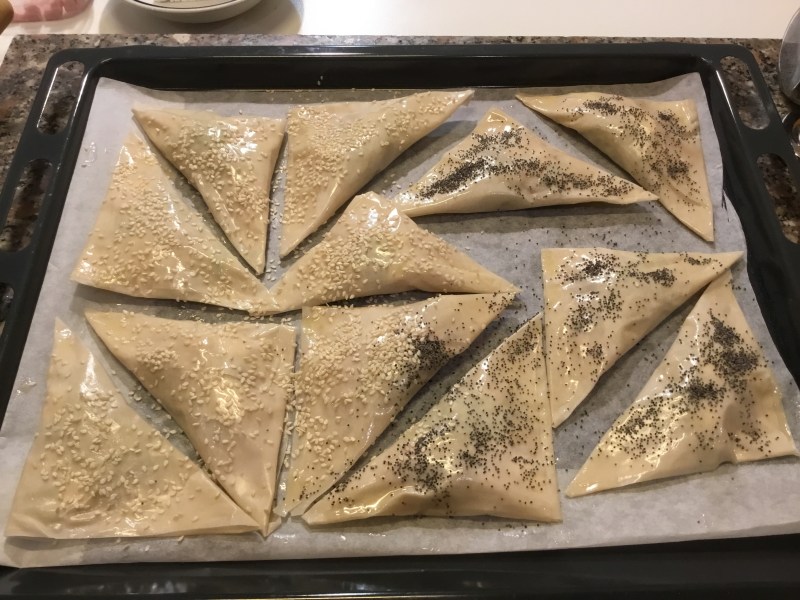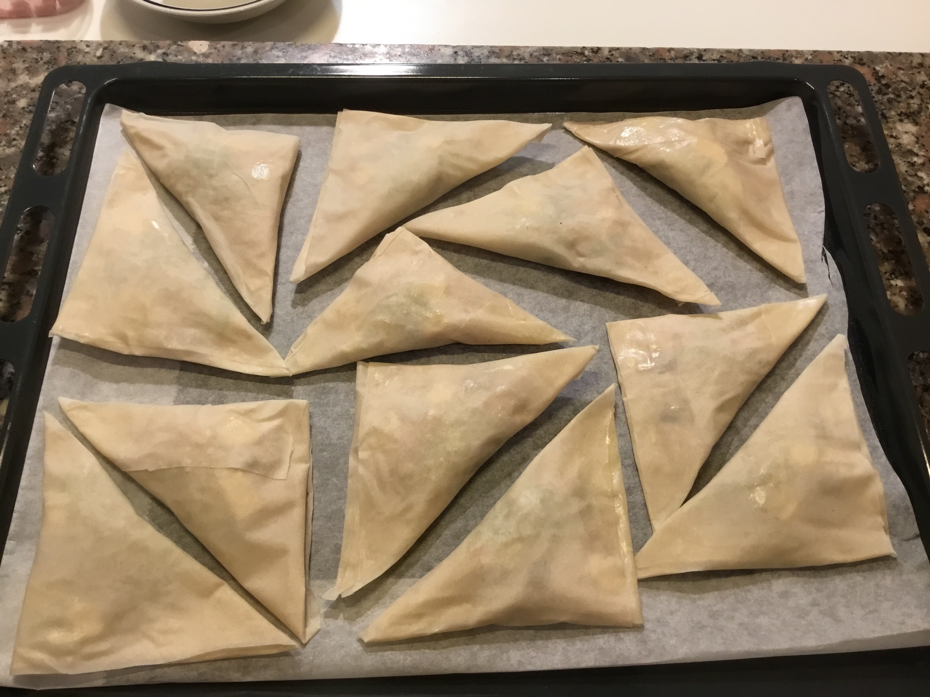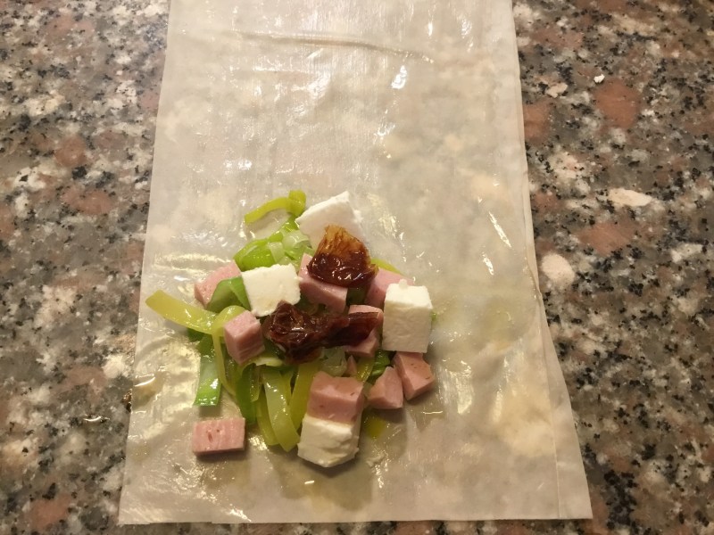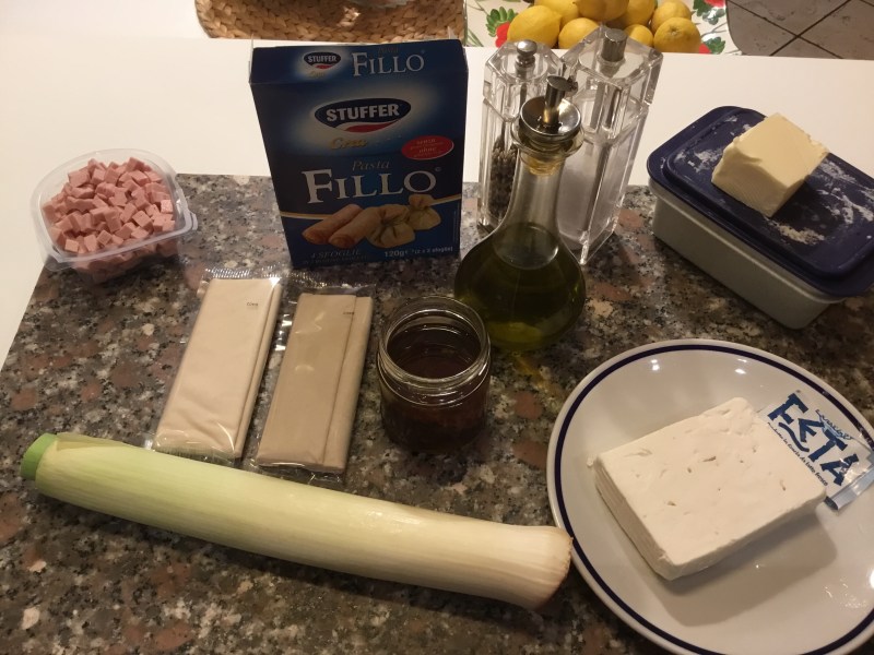 TRIANGOLI DI PASTA FILLO CON FETA, PORRI, PROSCIUTTO