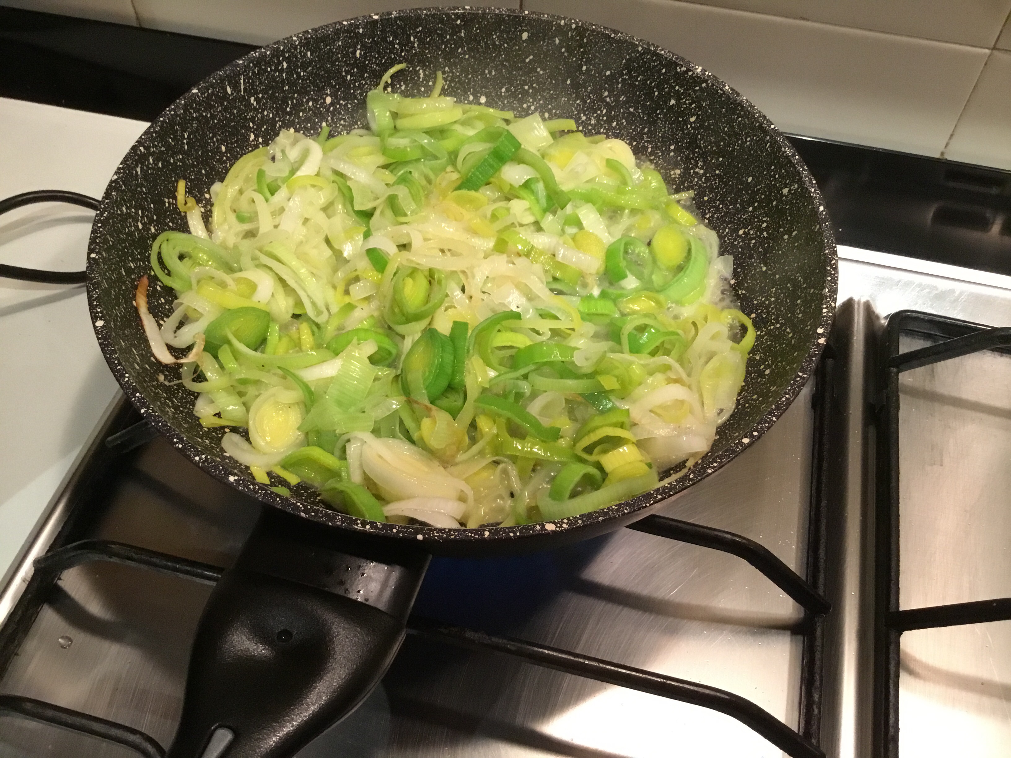Affetto finemente il porro e lo cuocio in padella con un goccio di olio e in caso di bisogno un goccio di acqua, aggiungo sale e pepe