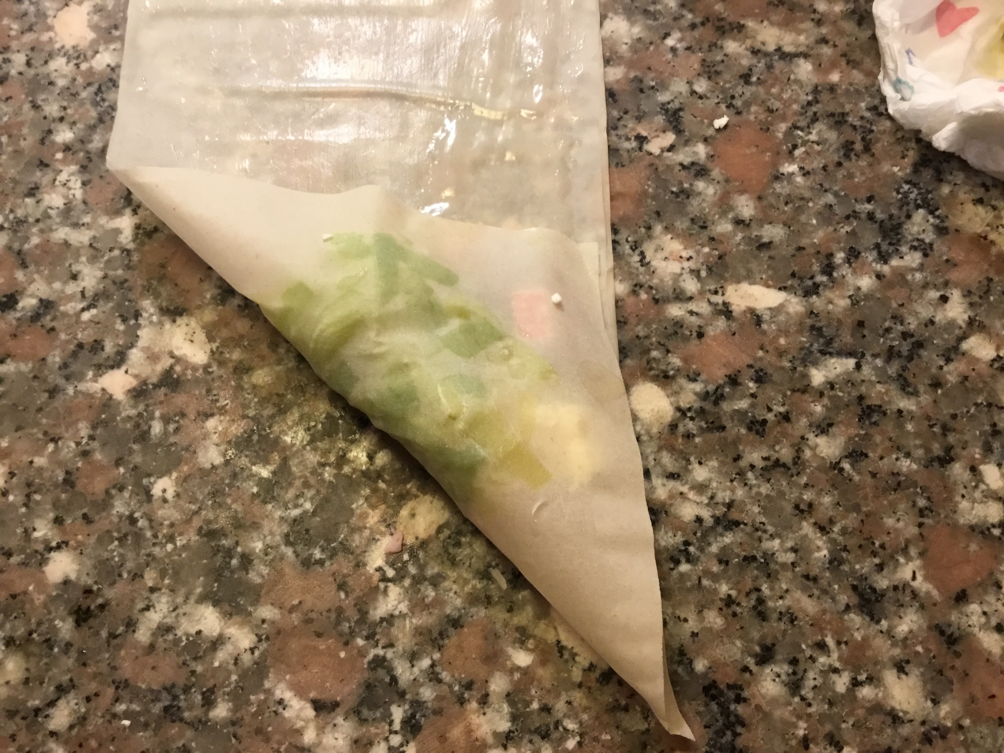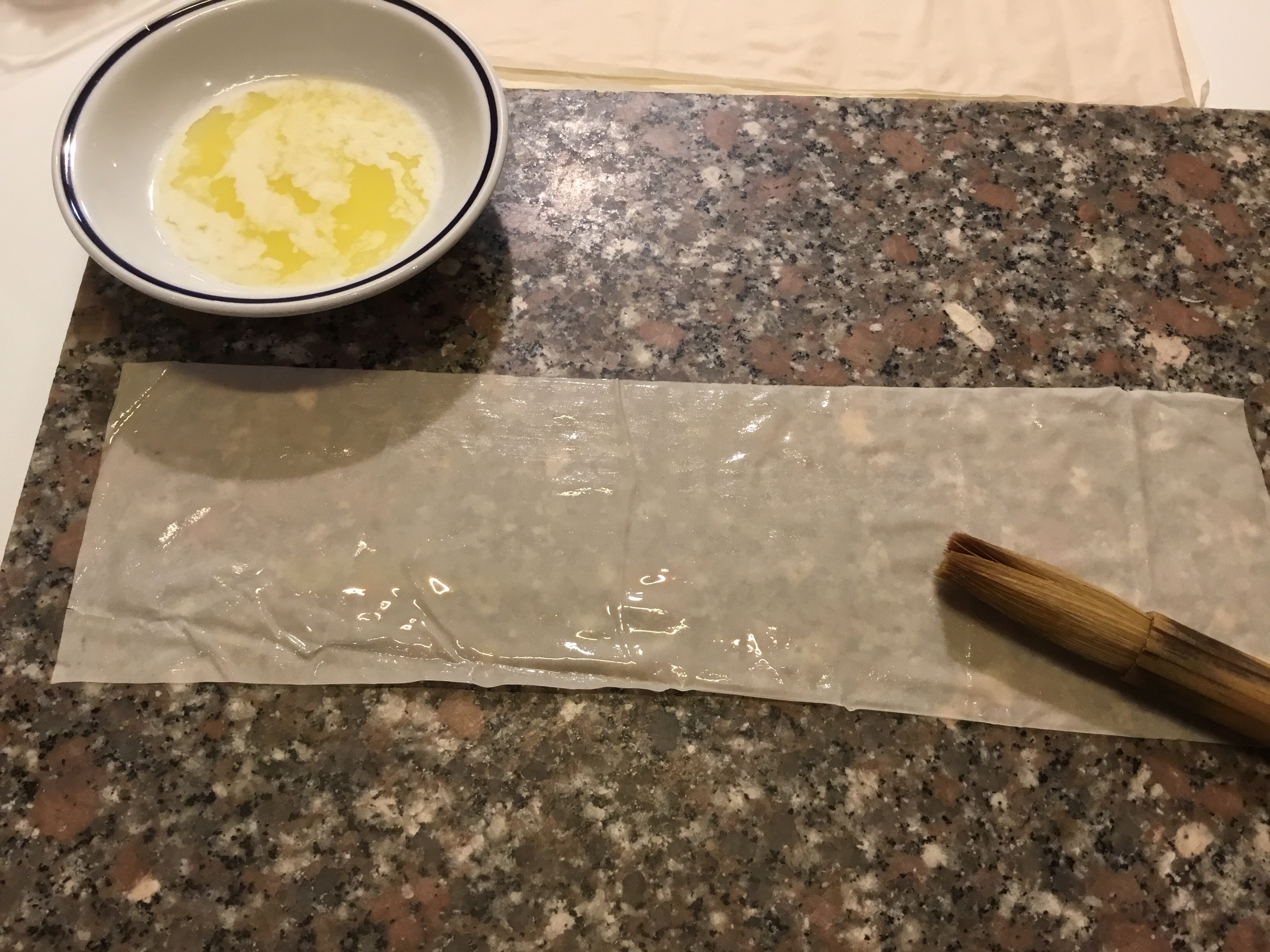 Taglio i fogli di pasta fillo in tre parti ottenendo delle lunghe striscie