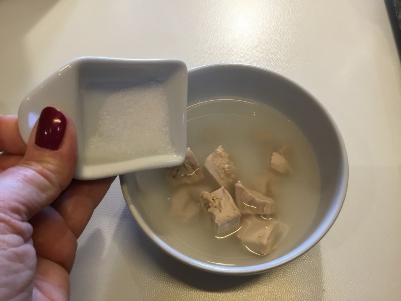In una ciotola sbriciolo il lievito, aggiungo un po’ di acqua della dose appena tiepida e lo zucchero e mescolo finché sono sciolti