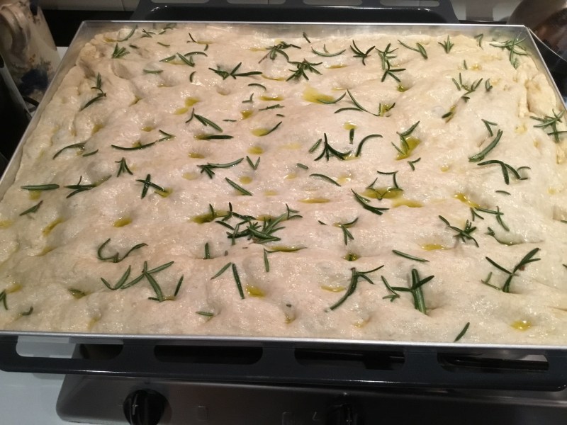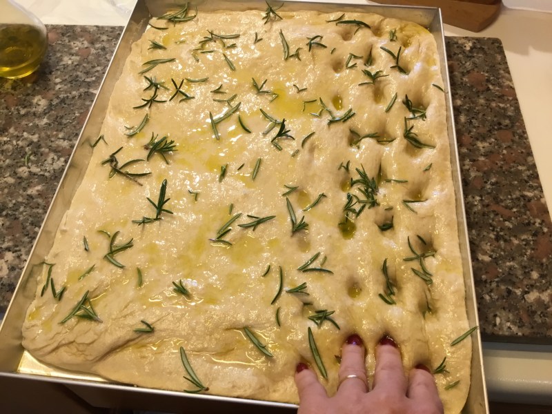 Cospargo con aghi di rosmarino e affondo la punta delle dita nell’impasto formando dei buchi profondi