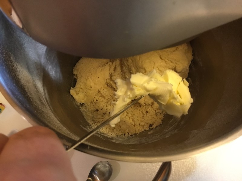 Aggiungo poco per volta il burro morbido, lavoro per circa 10/15 minuti finché l’impasto risulta ben incordato ed omogeneo