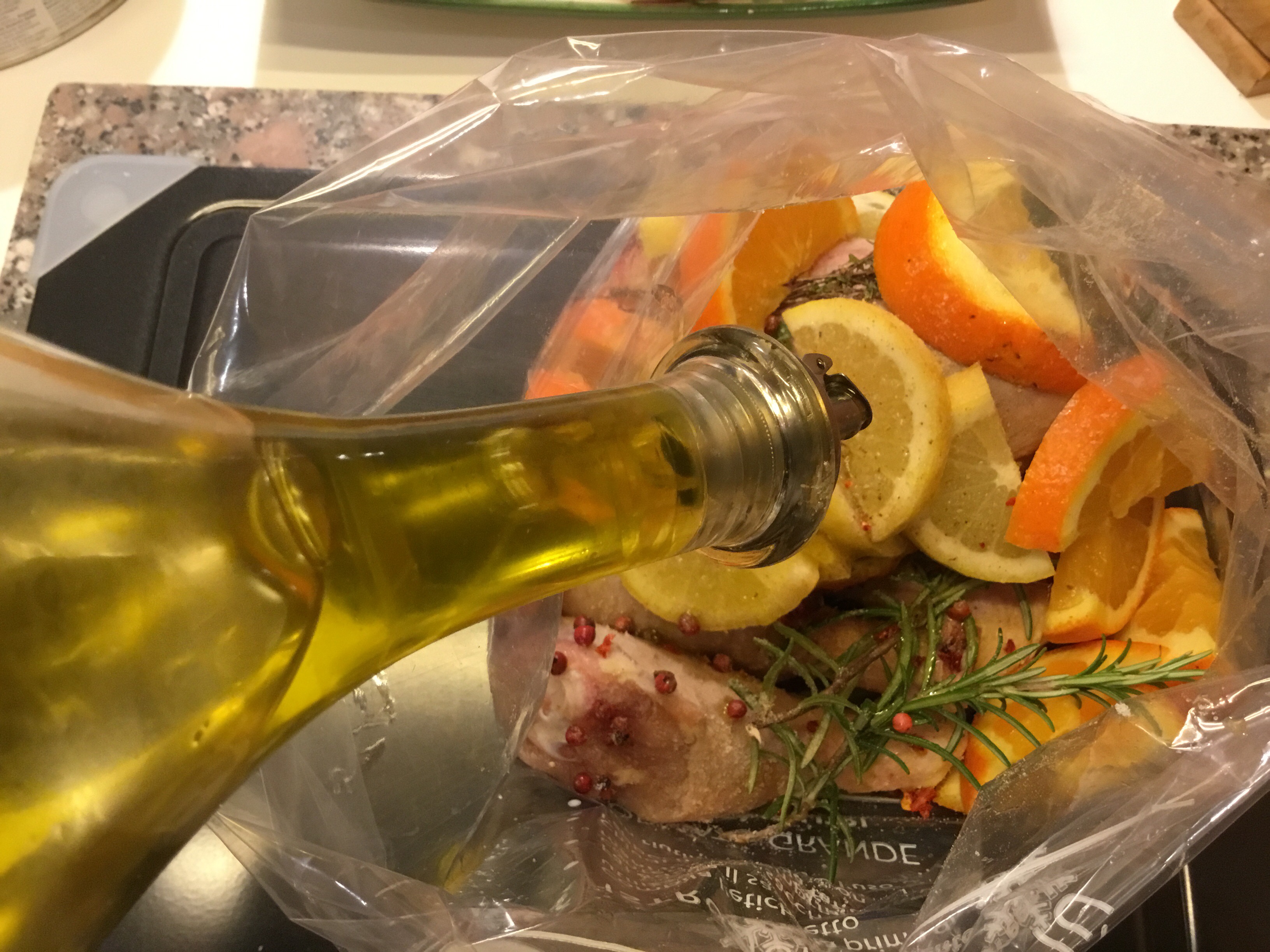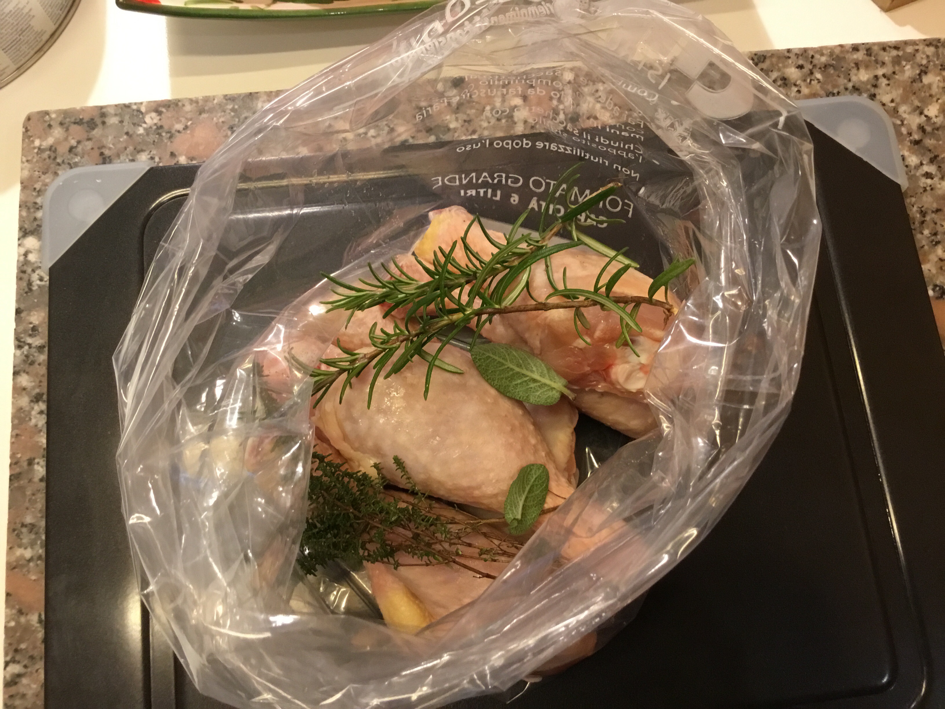 Metto il pollo in un sacchetto per alimenti e aggiungo le erbe aromatiche