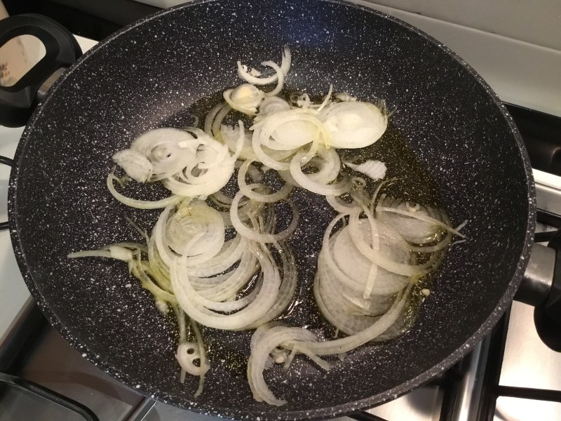 In una larga padella verso una dose abbondante di olio e la cipolla e la lascio rosolare