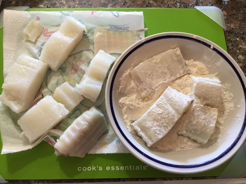Intanto taglio il baccalà a pezzi e li infarino