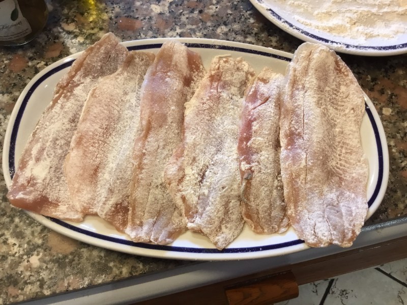 Calcolate 2 filetti a porzione, se piccoli 3, il mio fornitore e pescatore mi porta quando li richiedo i filetti già pronti senza pelle, quindi dopo averli lavati e asciugati, li infarino scuotendoli per eliminare l’eccesso