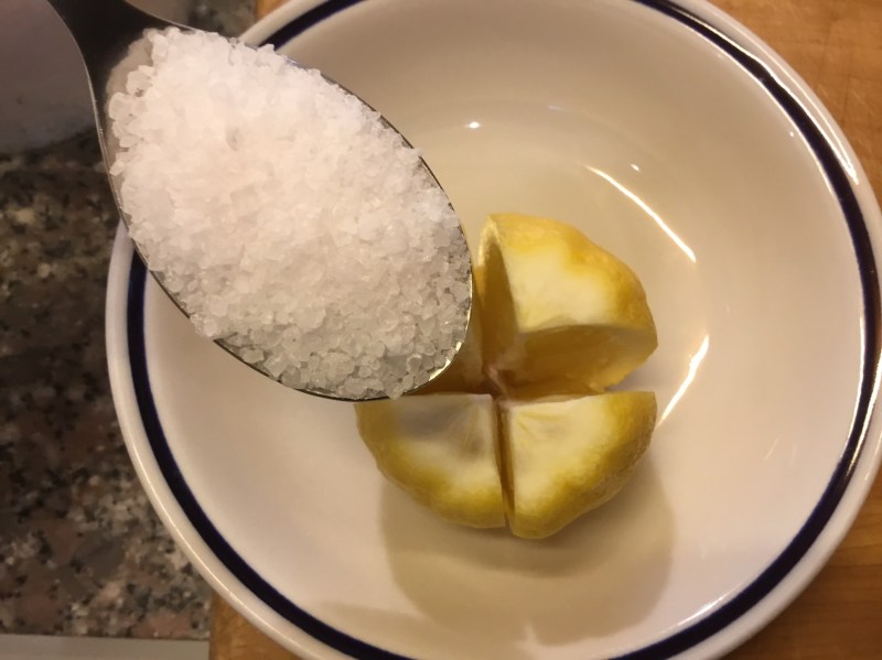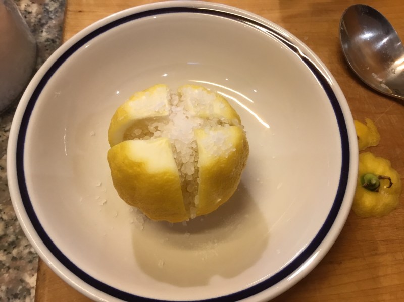 Incido a croce i limoni lasciando il fondo attaccato, verso al centro di ogni limone un cucchiaio di sale dopo averli aperti leggermente