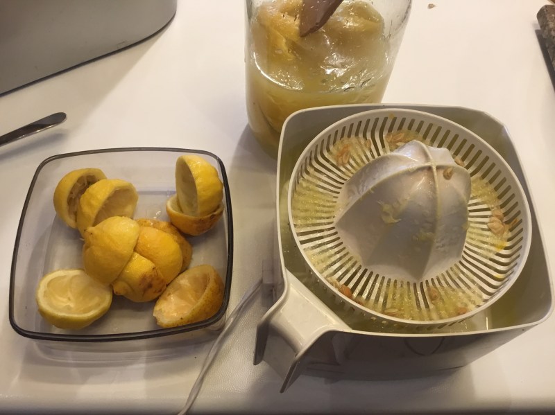 Trascorsa una settimana apro il vaso e schiaccio i limoni il più possibile per farne uscire il succo, spremo gli altri 6 limoni e verso il succo nel vaso