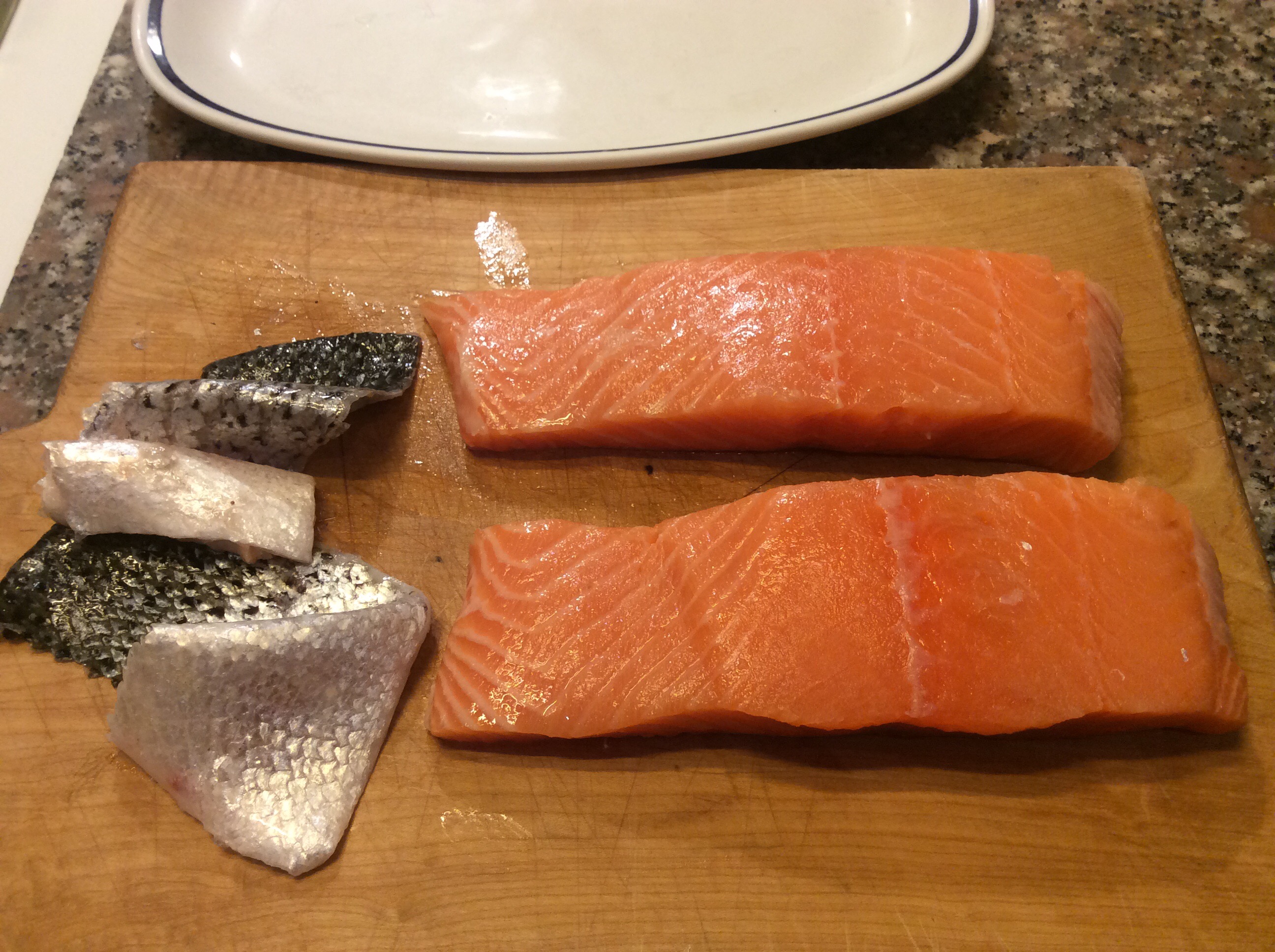 Tolgo la pelle al salmone e controllo se ci sono eventuali lische