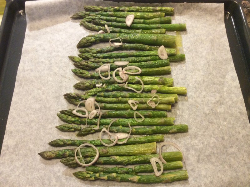 Sforno gli asparagi lasciando il forno acceso, distribuisco una parte dello scalogno