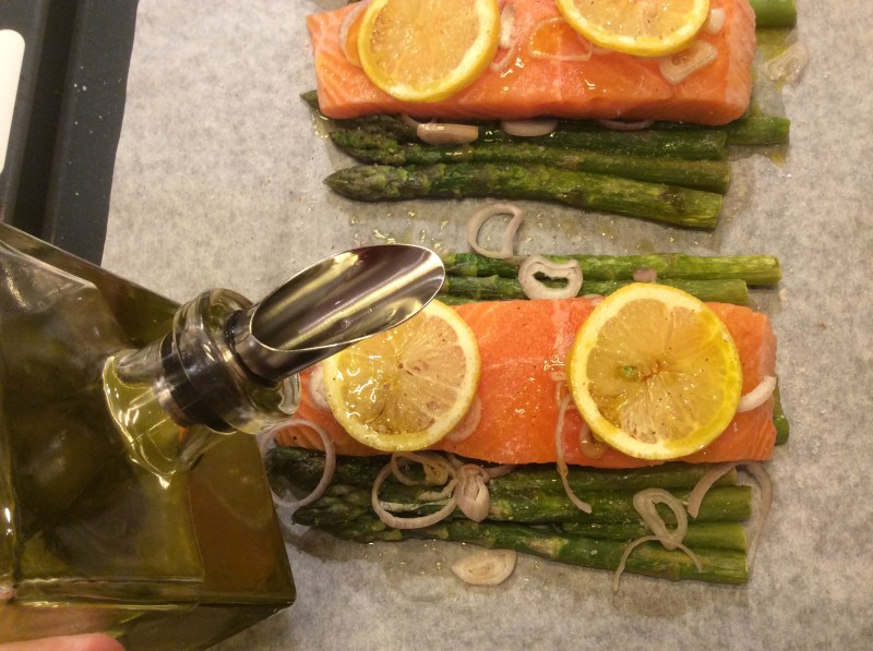 Sulla placca del forno stendo un foglio di carta forno e dispongo gli asparagi aggiungo sale, pepe e olio extravergine