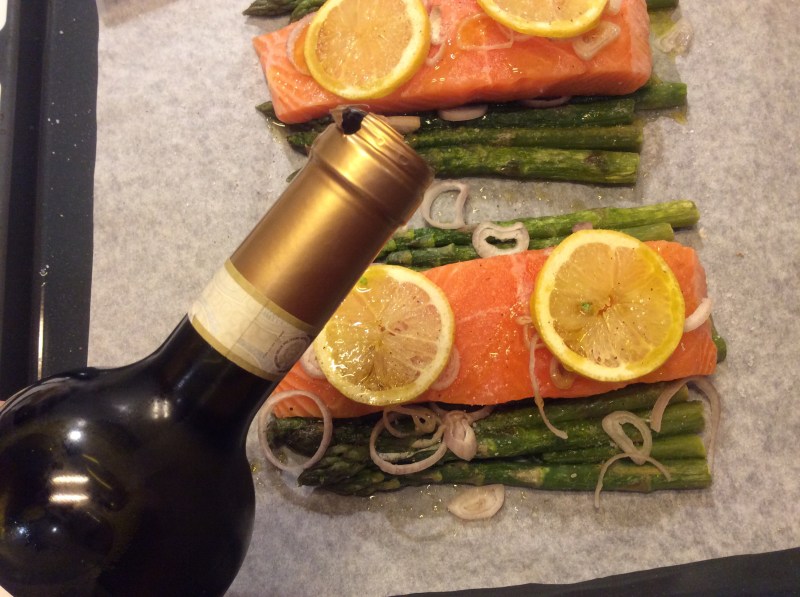 Appoggio i tranci di salmone, aggiungo il resto dello scalogno, alcune rondelle di limone