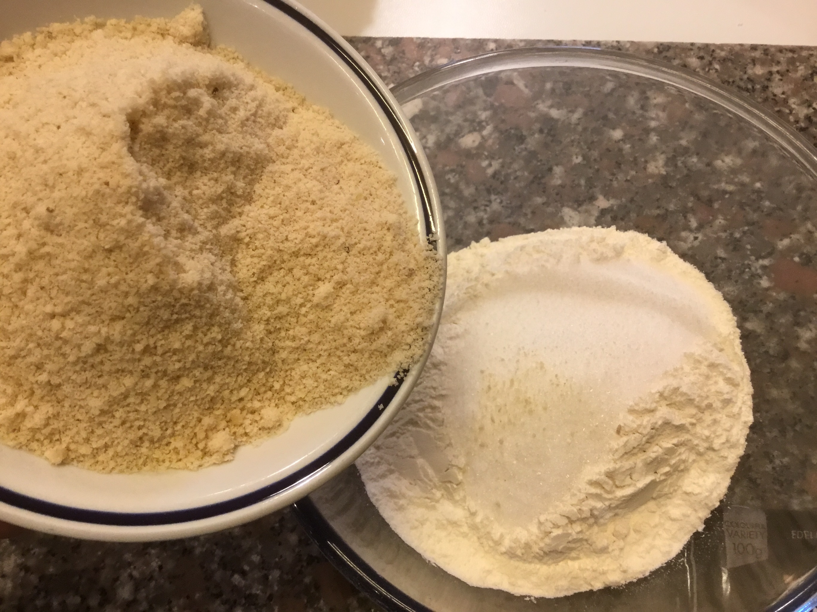 In una ciotola verso la farina, lo zucchero e aggiungo le mandorle