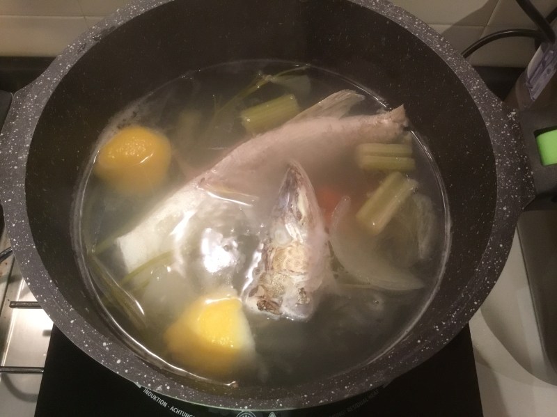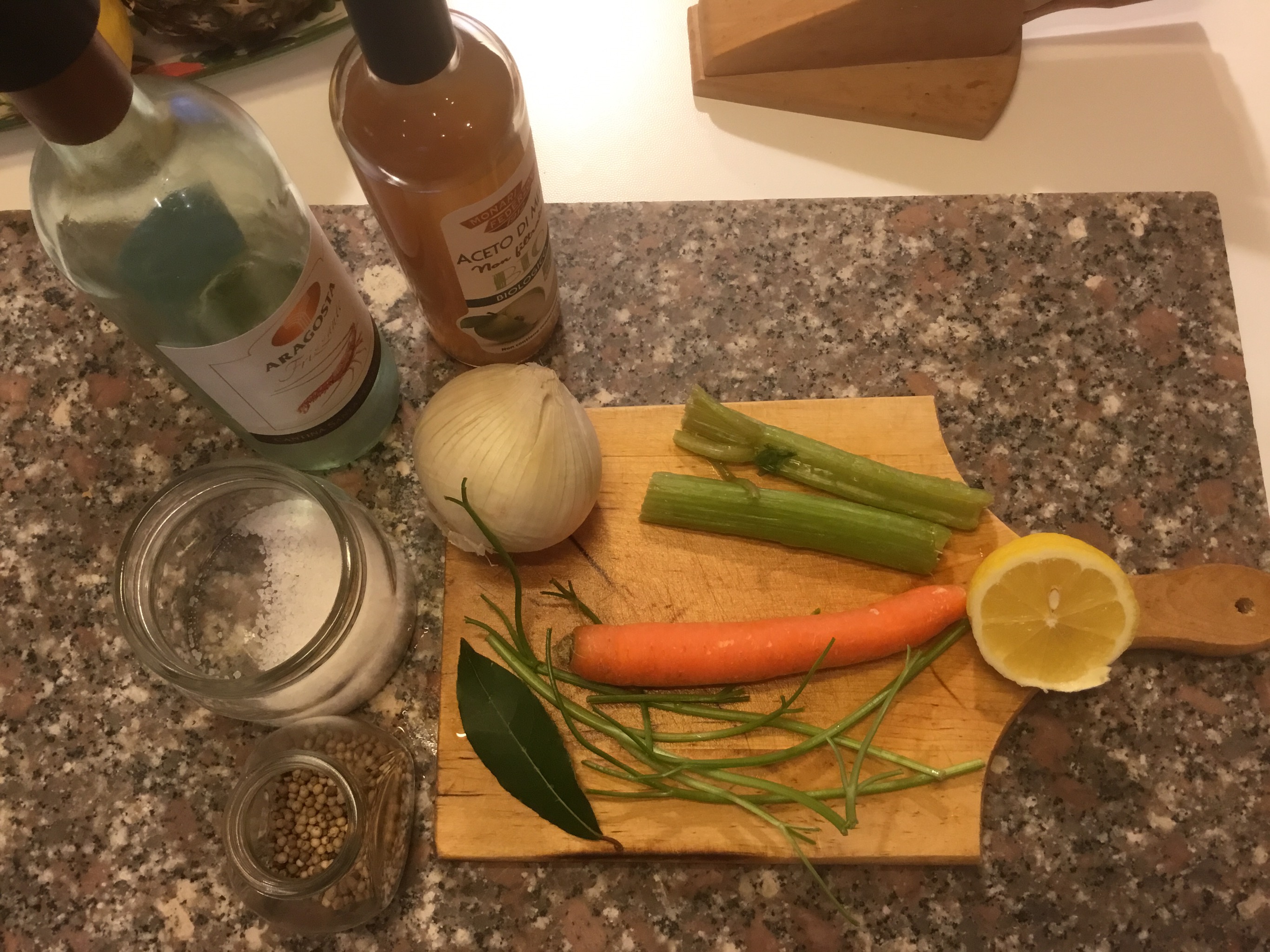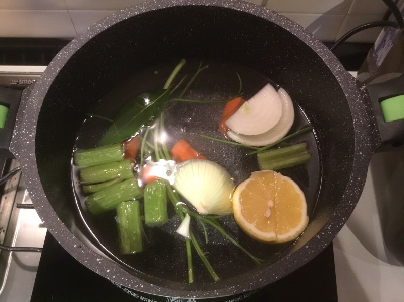 In un padella o pesciera verso l’acqua con tutti gli ingredienti porto a bollore e lascio per una decina di minuti