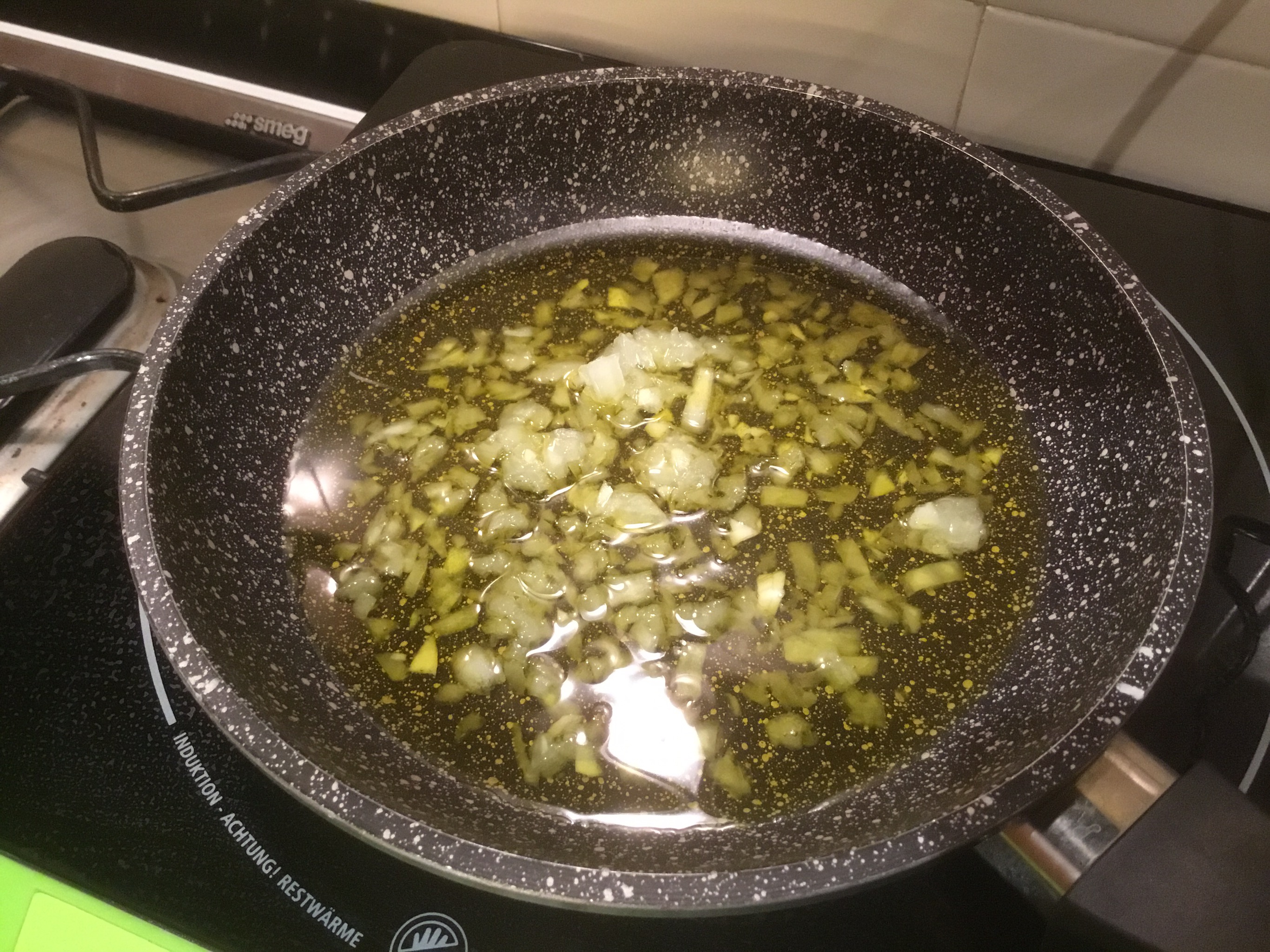 Trito la cipolla e l”aglio finemente e la metto in una padella con l”olio e la lascio appassire