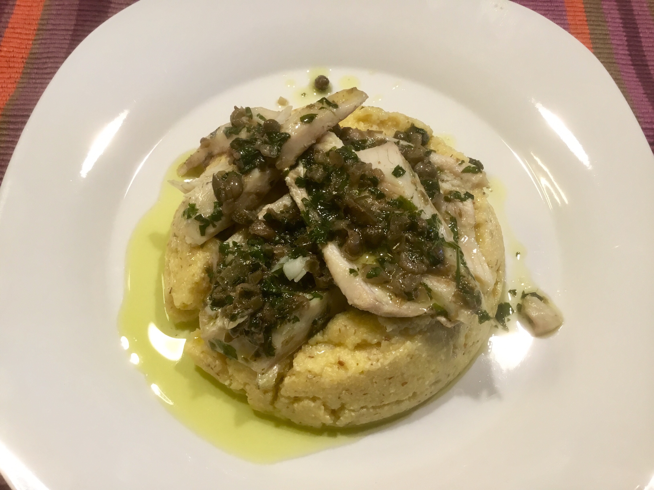 Copro con la pellicola e lascio in frigorifero ad insaporire per una notte, il giorno dopo preparo una polenta morbida, la verso in un anello di acciaio per darle una forma poi adagio i filetti che ho tolto dal frigorifero e leggermente riscaldati e servo subito