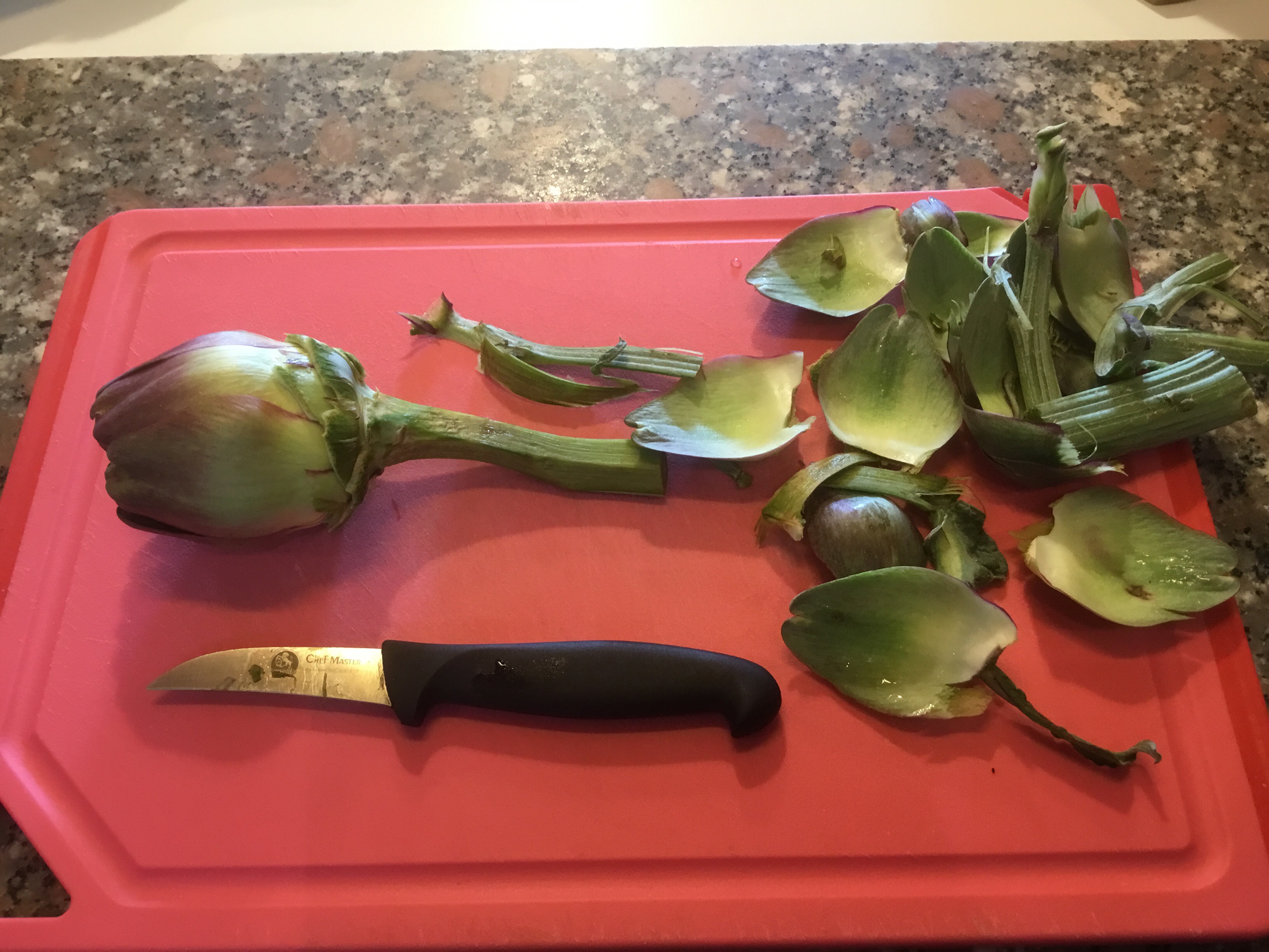 Pulisco i carciofi eliminando le foglie più esterne elimino la parte più fibrosa del gambo quindi lo spelo con un pelapatate o uno spelucchino