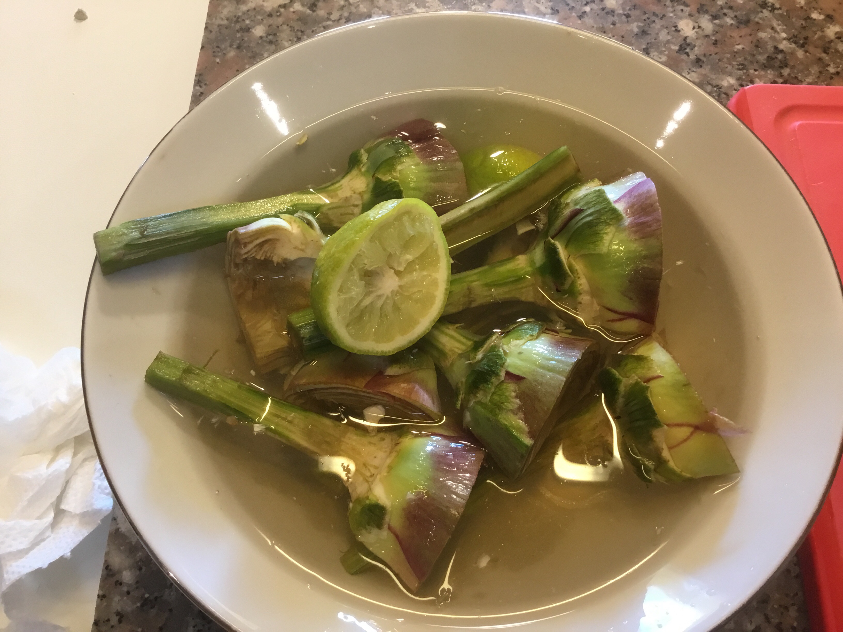 I carciofi puliti li inserisco in una ciotola piena di acqua e mezzo limone spremuto per evitare che anneriscano