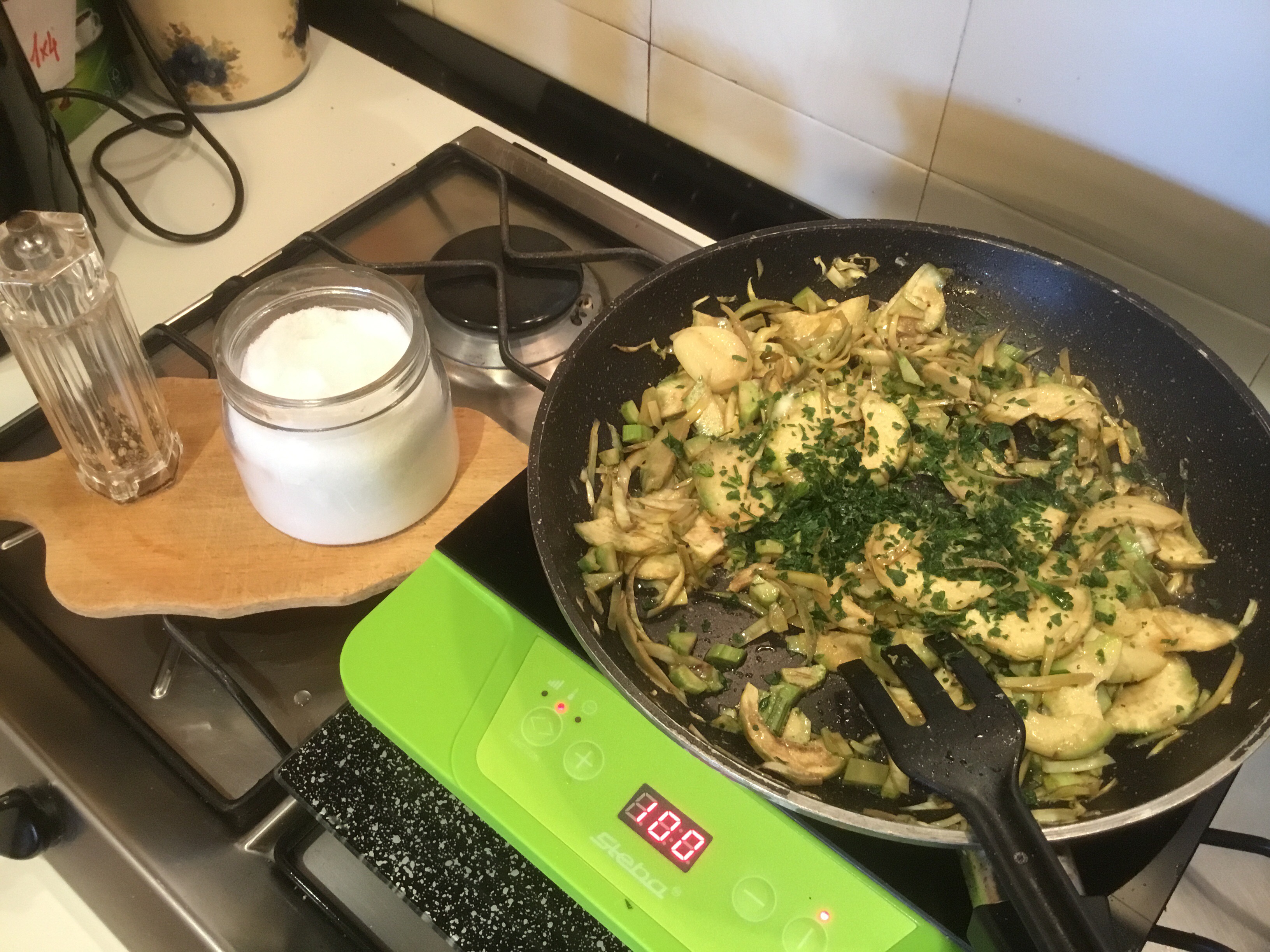 In una larga padella verso un goccio di olio e uno spicchio di aglio cuocio i carciofi con un goccio di acqua, sale e pepe porto a cottura lasciando i carciofi croccanti aggiungo il prezzemolo tritato