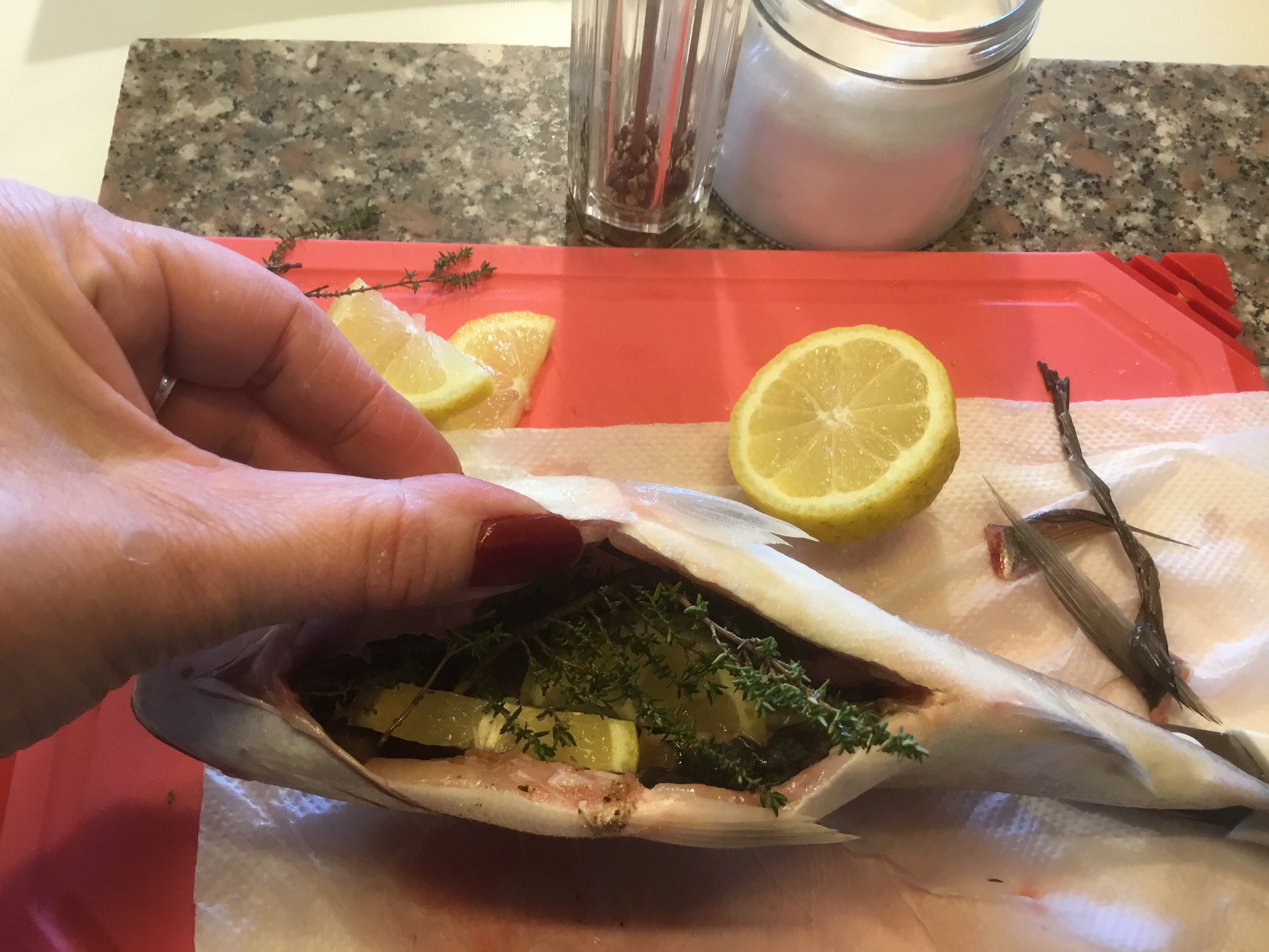 Inserisco nella pancia un rametto di timo, 2 fette di limone sale e pepe