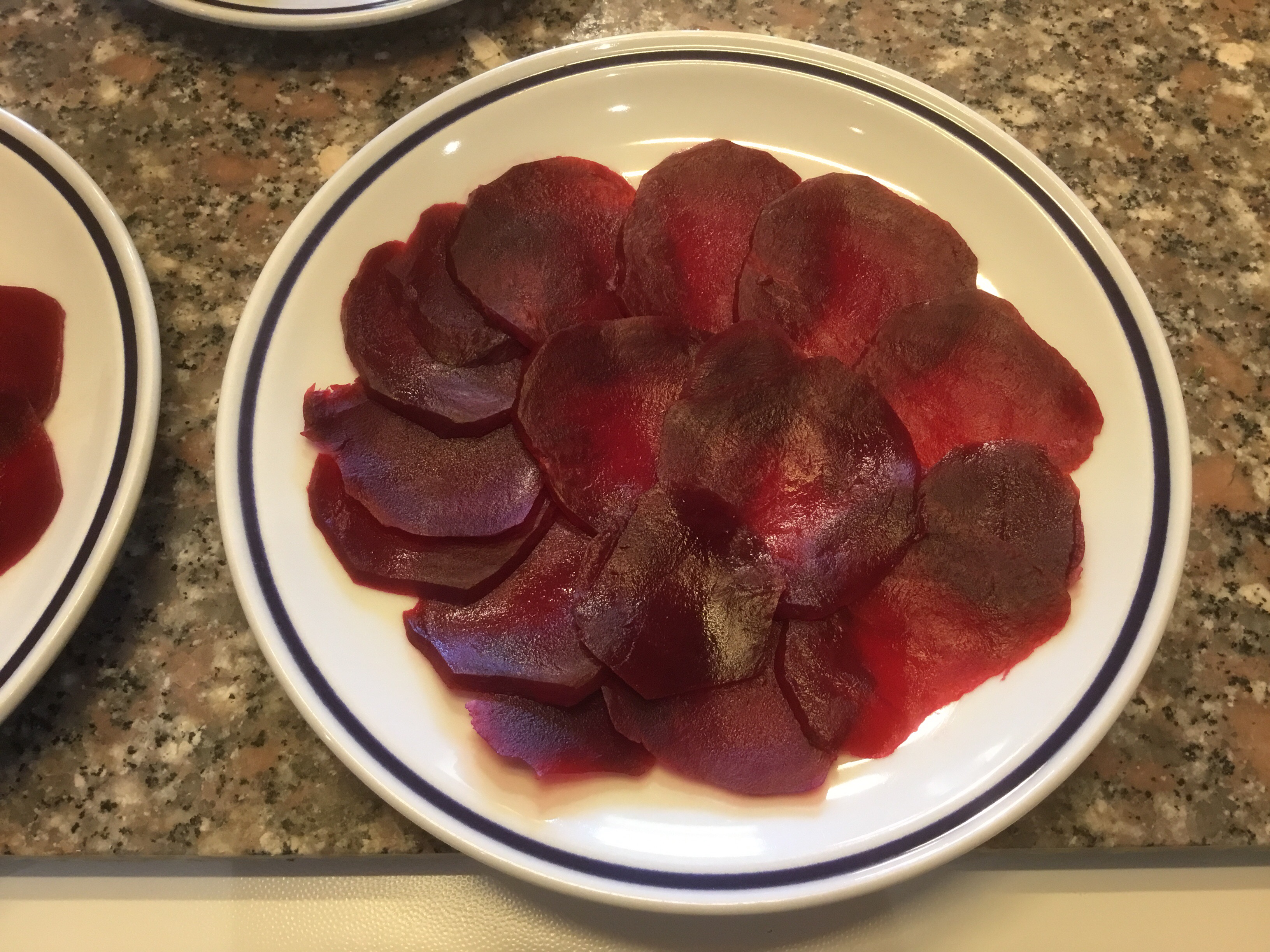 Compongo il piatto, appoggio le pere sulle barbabietole alcune rondelle di formaggio