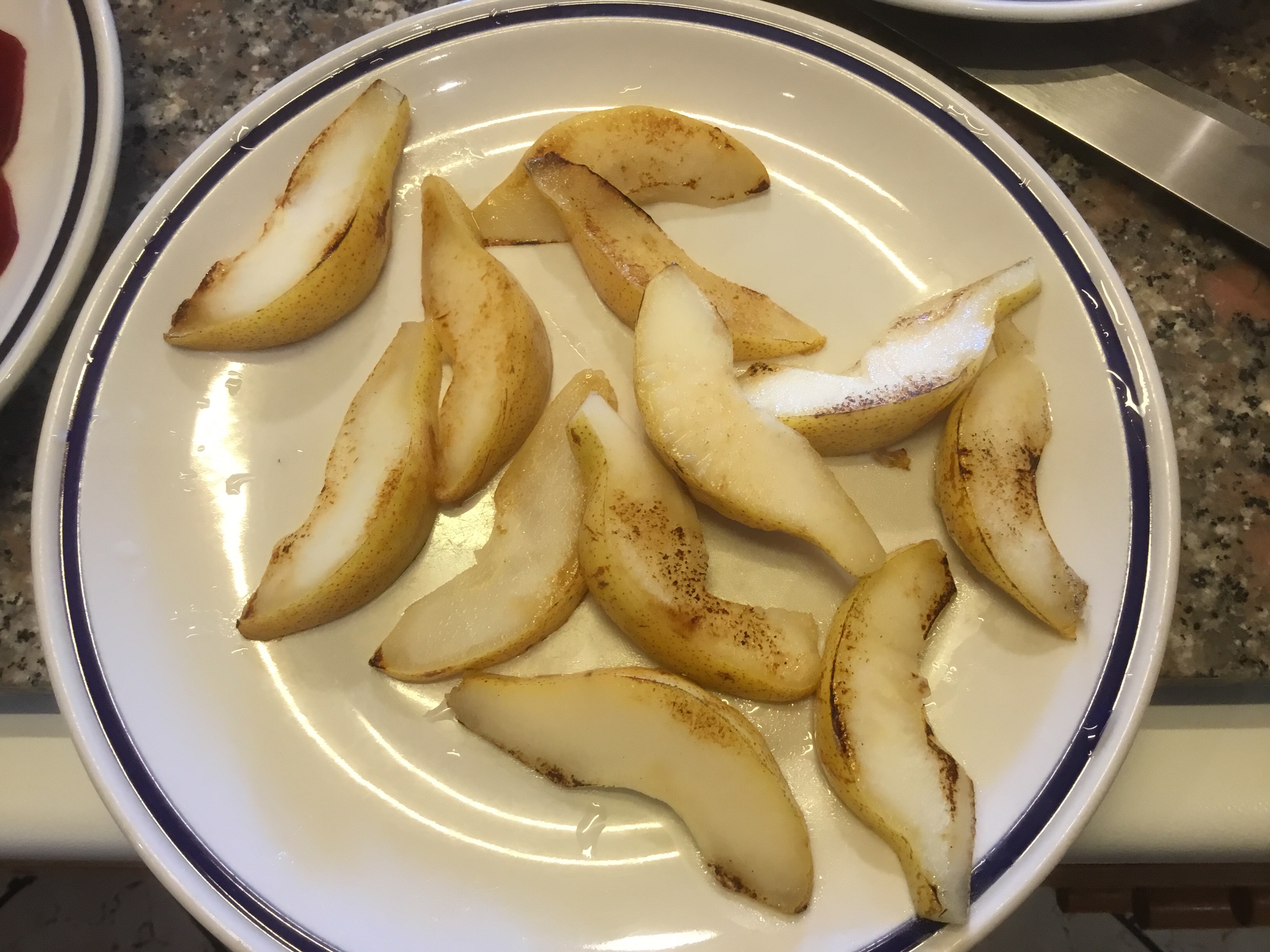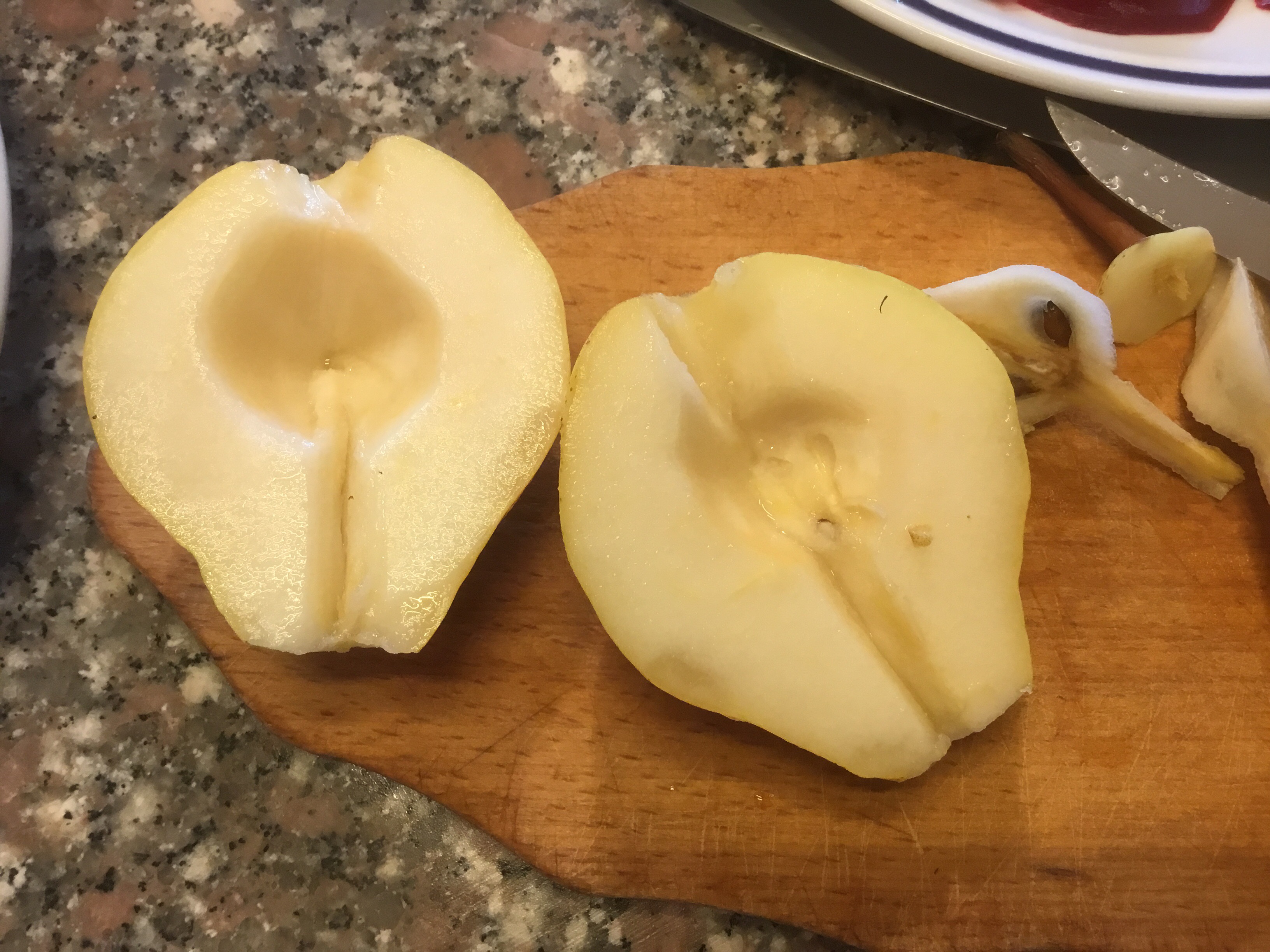 Lavo la pera lasciando la buccia la taglio a metà, tolgo il torsolo